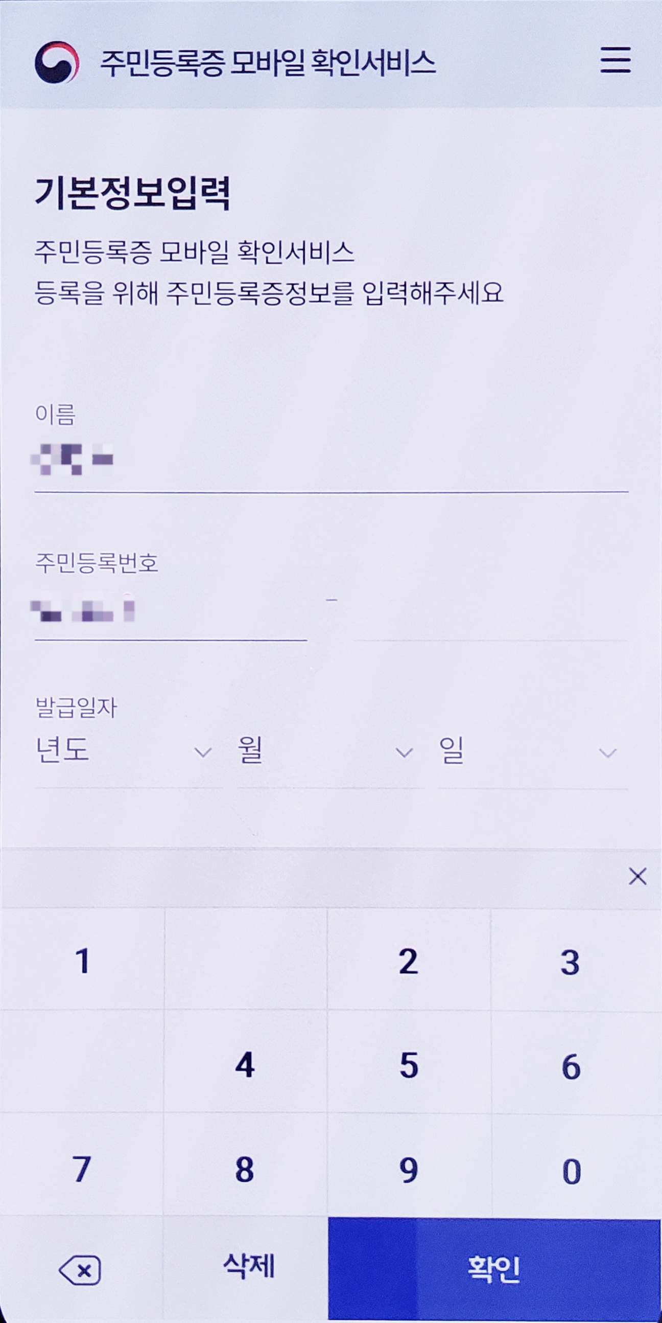 인증을 마쳤으면 이름, 주민등록번호, 주민등록증 발급일자 (생년월일 아님!!!)을 확인해준다.