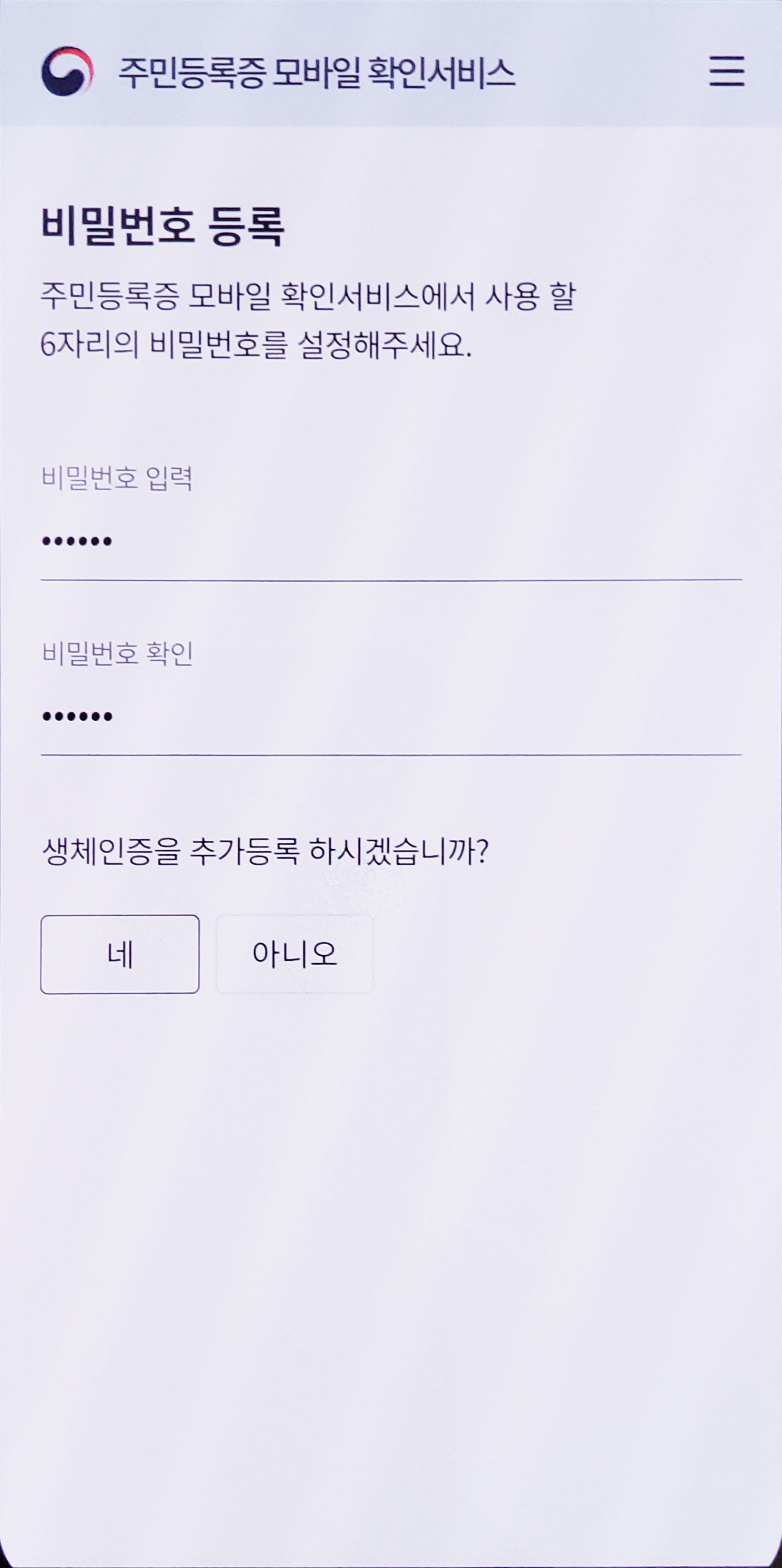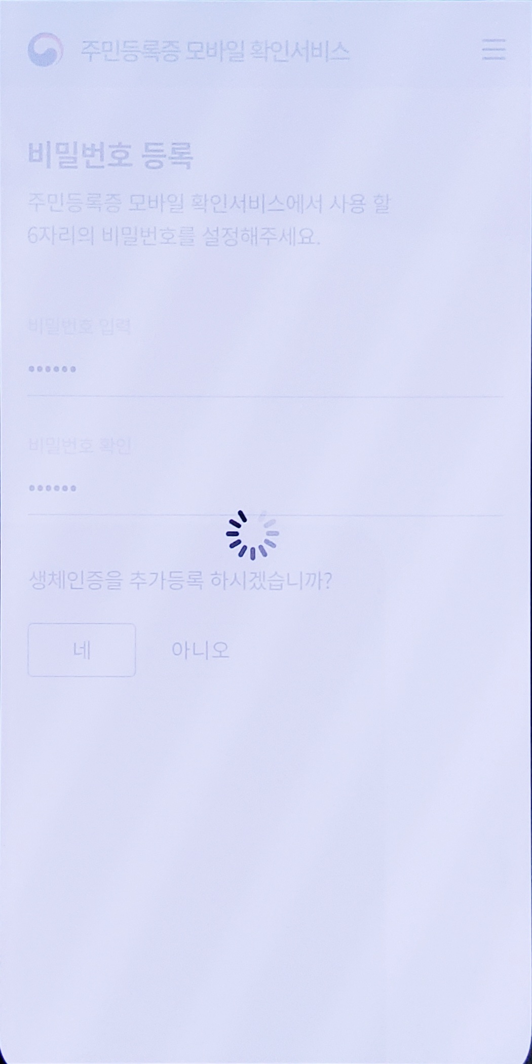 마지막으로 확인용 6자리 비밀번호를 입력하고, 생채인증 등록 여부를 확인하면 끝...이어야 하는데, 이상하게 로딩단계에서 멈춰 다음 단계로 도저히 넘어가지 않았다. 이럴거면 차라리 점검을 계속 하던가... 역시 포기.