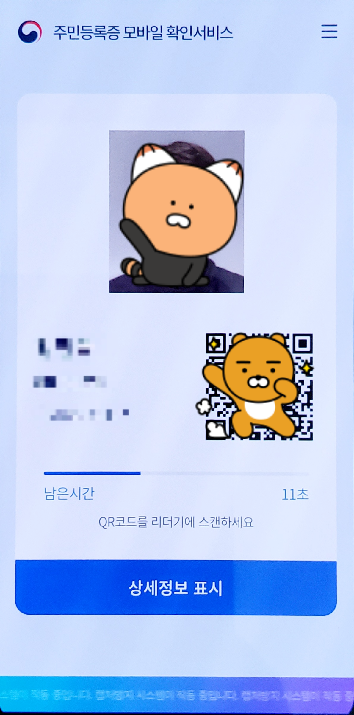 민증 사진, 이름, 생년월일, 주소지(시/군/구까지), 인증용 QR코드가 있고, 캡쳐방지를 위해 하단에 구르는 문구띠가 있다. 상세정보 표시를 누르고 비밀번호 인증을 하면 주민등록번호, 상세 주소지 등 자세한 정보들이 나온다.