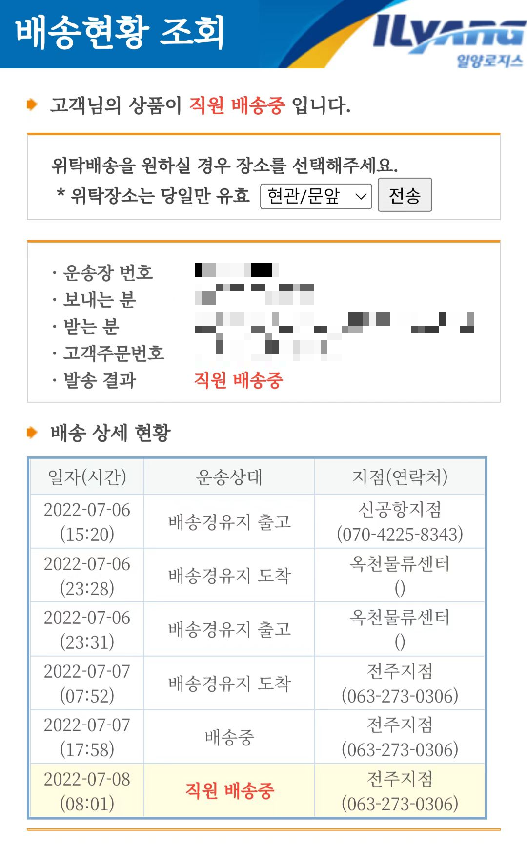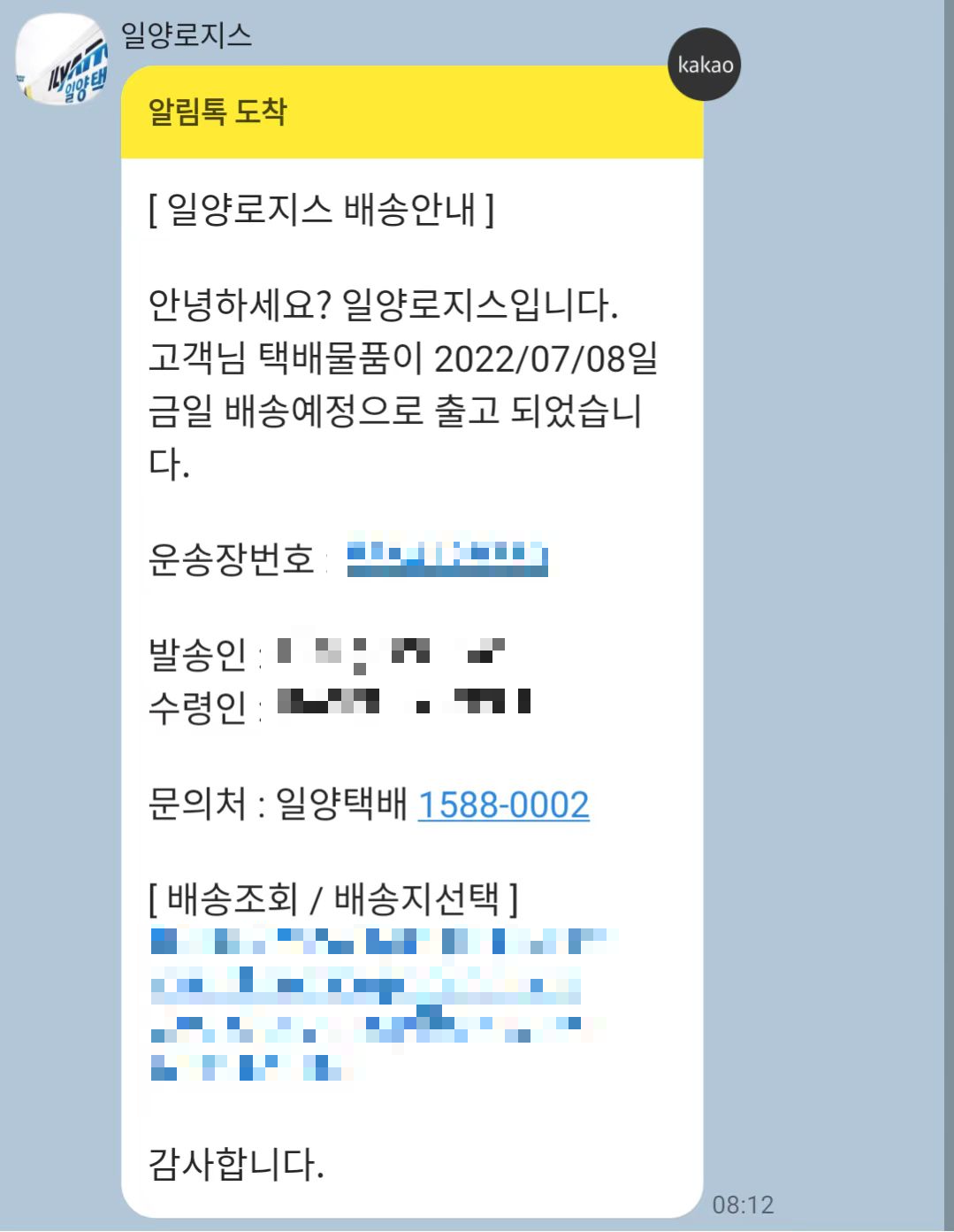 원래는 7월 4일에 보내서 9일 12시 이전 도착 예정이라고 했는데, 8일 아침에 배송예정 알림톡이 왔다 (원래 순펑은 웬만하면 예정 배송일보다 하루 일찍 왔었다). 일양로지스는 평소엔 존재감이 없지만 미국 비자업무와 DHL, UPS 위탁배송으로 유명한 회산데, 순펑택배의 국내 배송 역시 일양로지스가 담당하나보다.