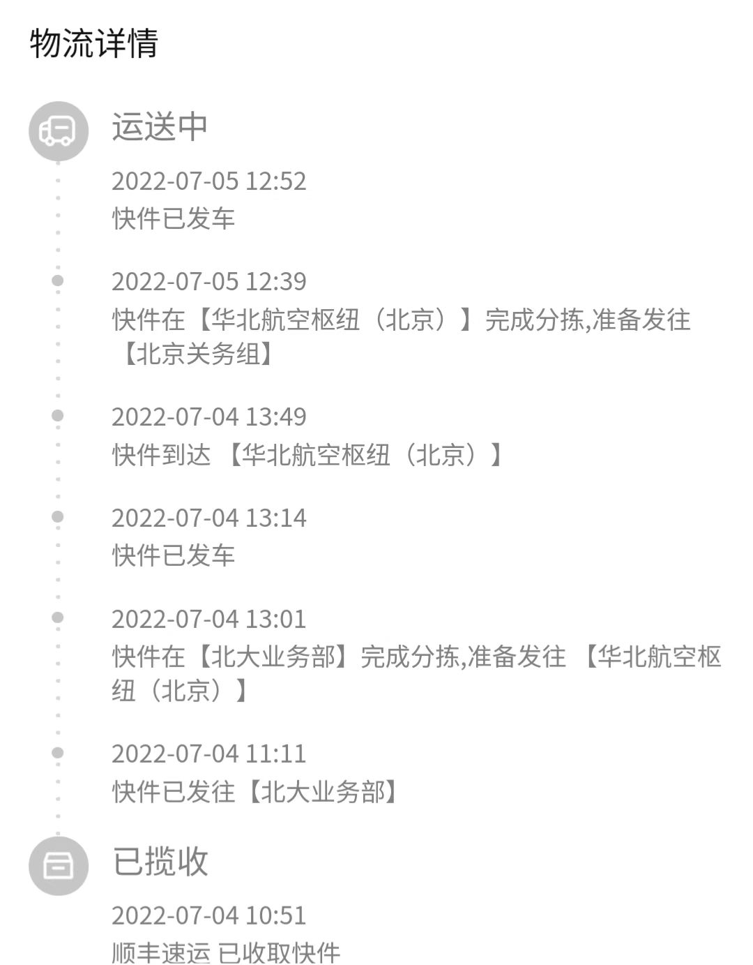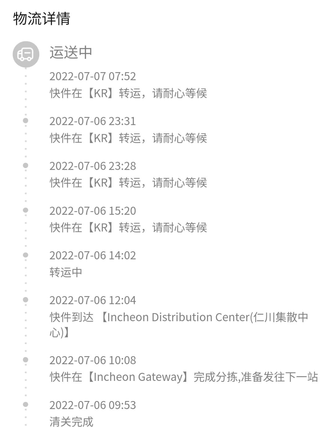 배송 조회 페이지. 중국 내에서는 어딨는지 잘 뜨다가 한국으로 들어오면 인천공항 물류센터를 떠난 순간 모든 경유지가 KR로 퉁쳐진다는 불편함이 있었다. 어디 엉뚱한데 갈까봐 불안했음.