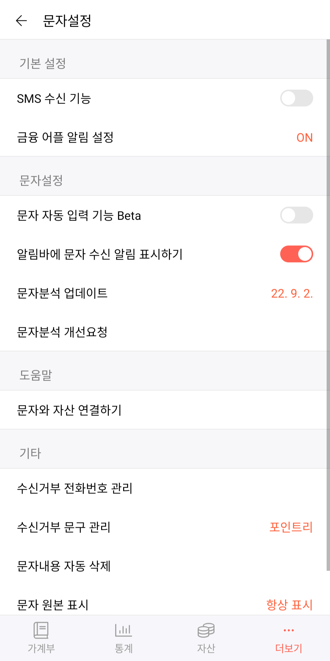 편한가계부의 두번째 편리한 점은 바로 카드사 문자나 금융 어플의 알림 내용을 자동으로 읽어들이고 분석해서 자동으로 가계부에 기록하는 기능이다. 덕분에 가계부 쓰는걸 까먹어버려서 날 잡아서 한번에 몰아서 쓰거나 잔액이 맞지 않아 가계부 정리를 포기하는 일은 거의 일어나지 않았다.