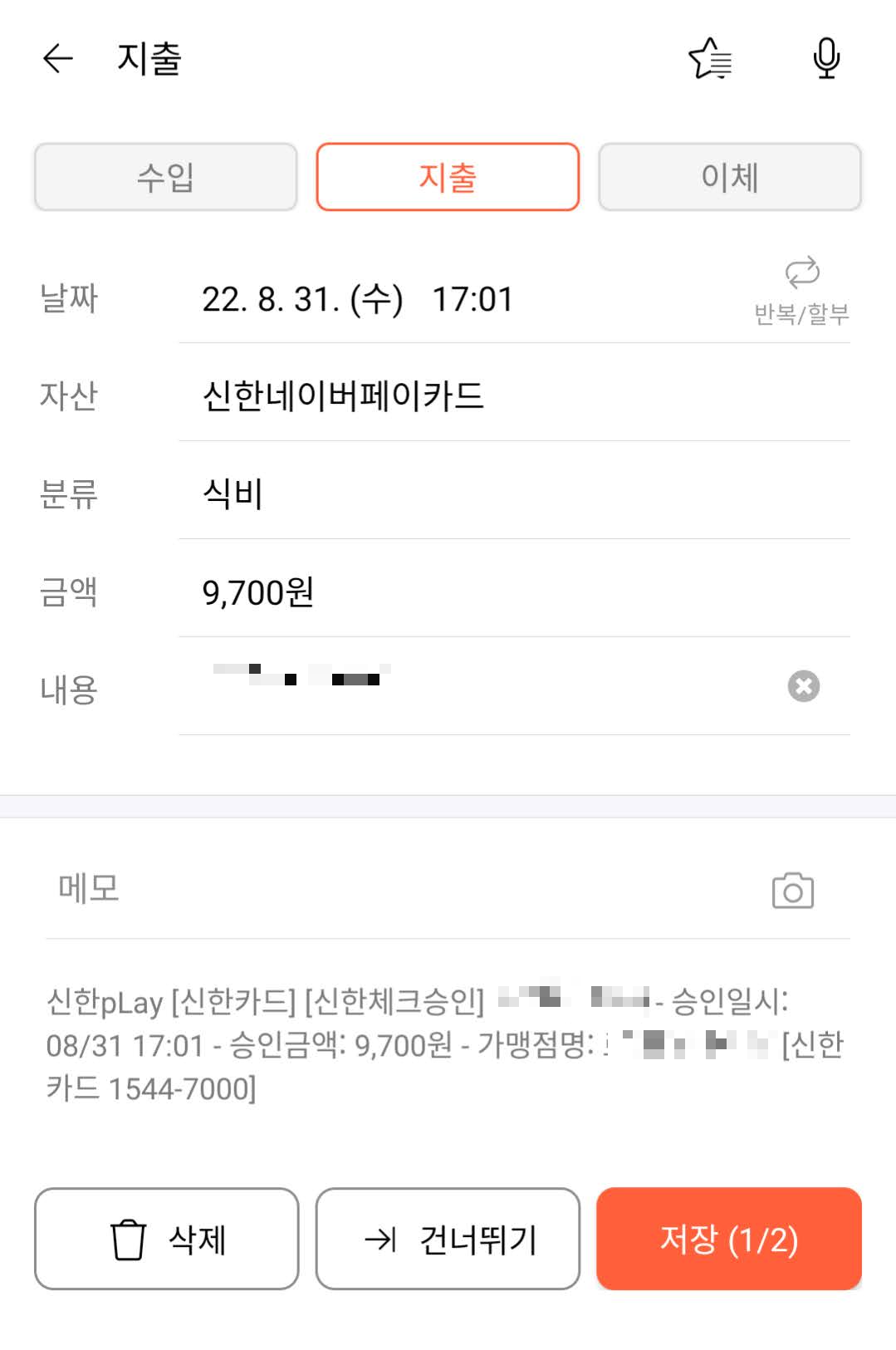 위 사진에서 볼 수 있듯이 신한플레이 앱에서 카드 승인내역 푸시알림 기능을 켰는데, 편한가계부에서 알림 내용을 확인하고 자동으로 읽어들여서 지출로 기록한 모습이다. 기록은 자동으로 저장되지는 않고, 편한가계부에 뜬 알림을 눌러 내역이 잘 불러왔는지 확인하고 수정할 사항이 있으면 수정해준 다음 저장하면 된다.