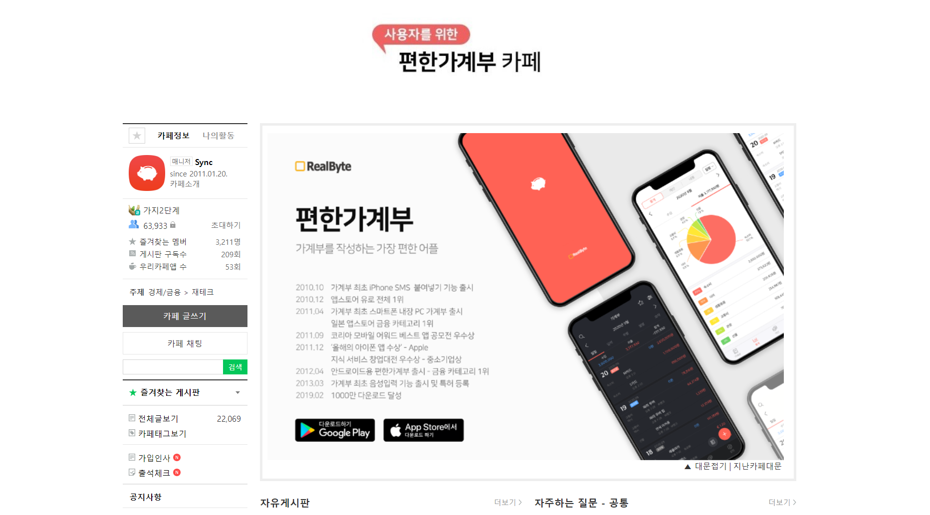 2011년부터 개발사에서 공식으로 운영중인 편한가계부 사용자 네이버카페. 개발사가 사용자들과 적극적으로 소통하는 모습이 보이는 부분이다.