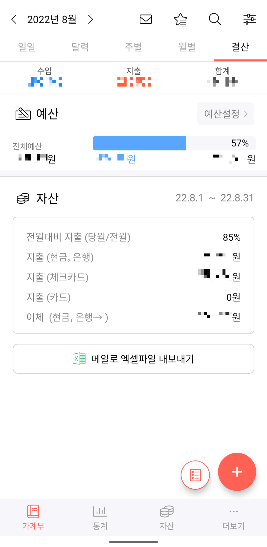 "결산" 탭에 들어가보면 현재까지 월간 총 지출이 얼마나 되는지 통계되며, 미리 월간 예산을 설정해놓으면 현재까지 예산을 얼마나 초과했는지도 볼 수 있다.