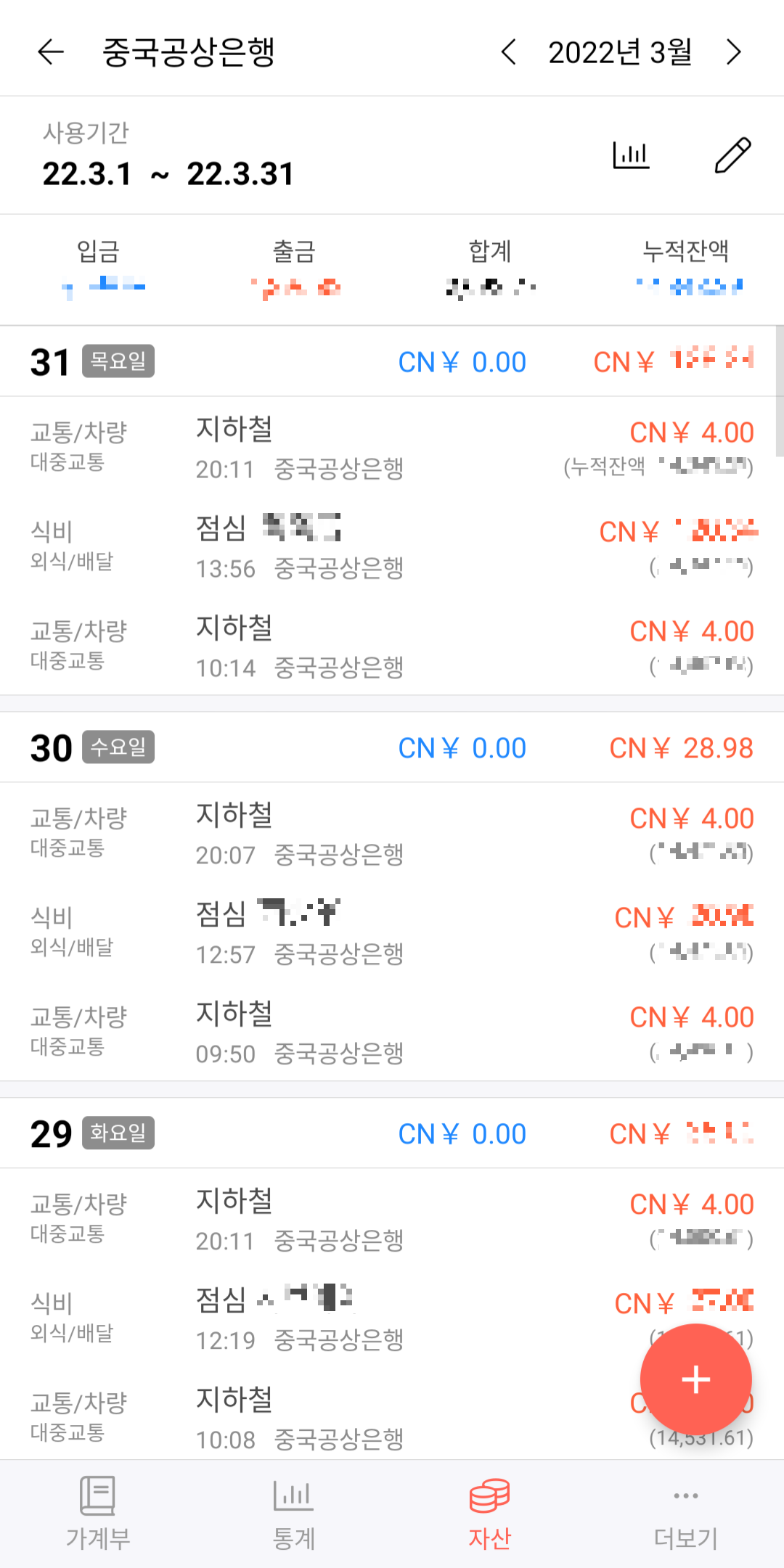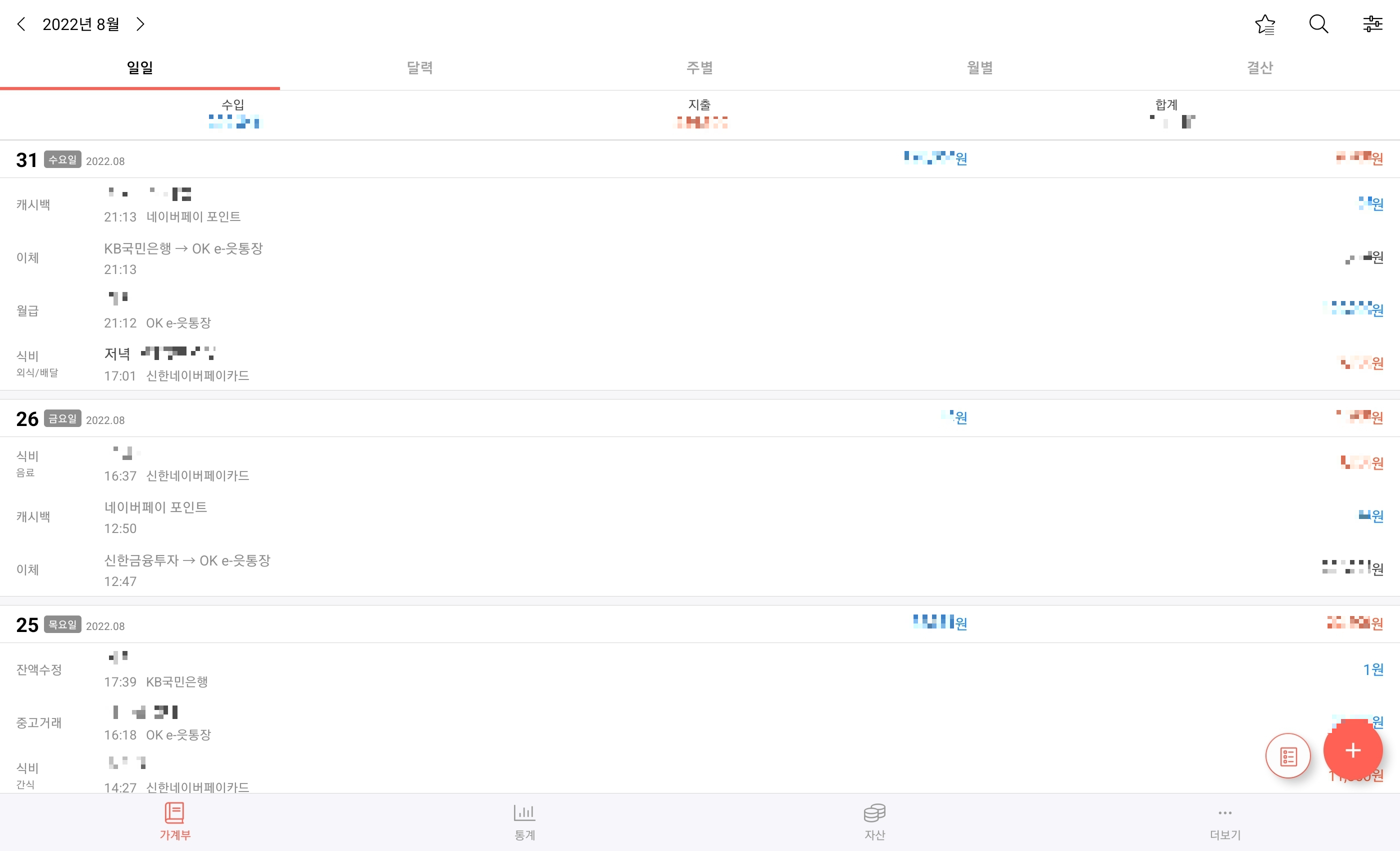 "통계"탭에 들어가보면 주/월/연/지정 기간동안 각 카테고리에서의 수입 및 지출 내역을, "자산"탭에서는 미리 설정해둔 각 자산 (현금, 통장, 카드, 예적금, 대출 등) 의 잔고 현황을 한눈에 파악할 수 있다.