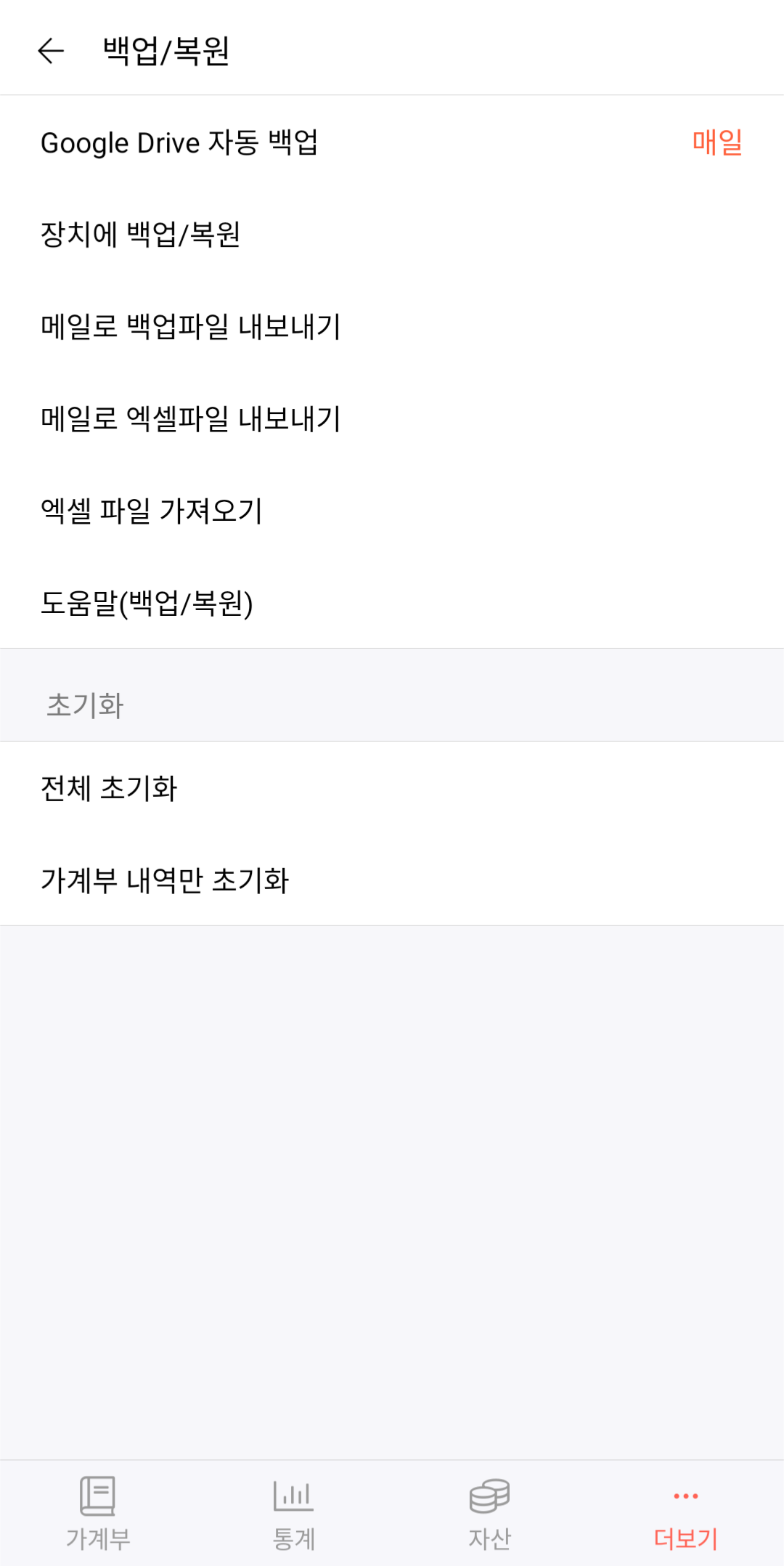 물론 예전부터 있었던 구글 드라이브 자동 백업 기능 역시 계속 제공하고있다. 이 기능을 켜두면 와이파이 상태에서 가계부 백업 파일이 자동으로 연동된 구글 계정의 드라이브에 저장되며, 나중에 휴대폰을 바꿀때 복원할 수 있다.