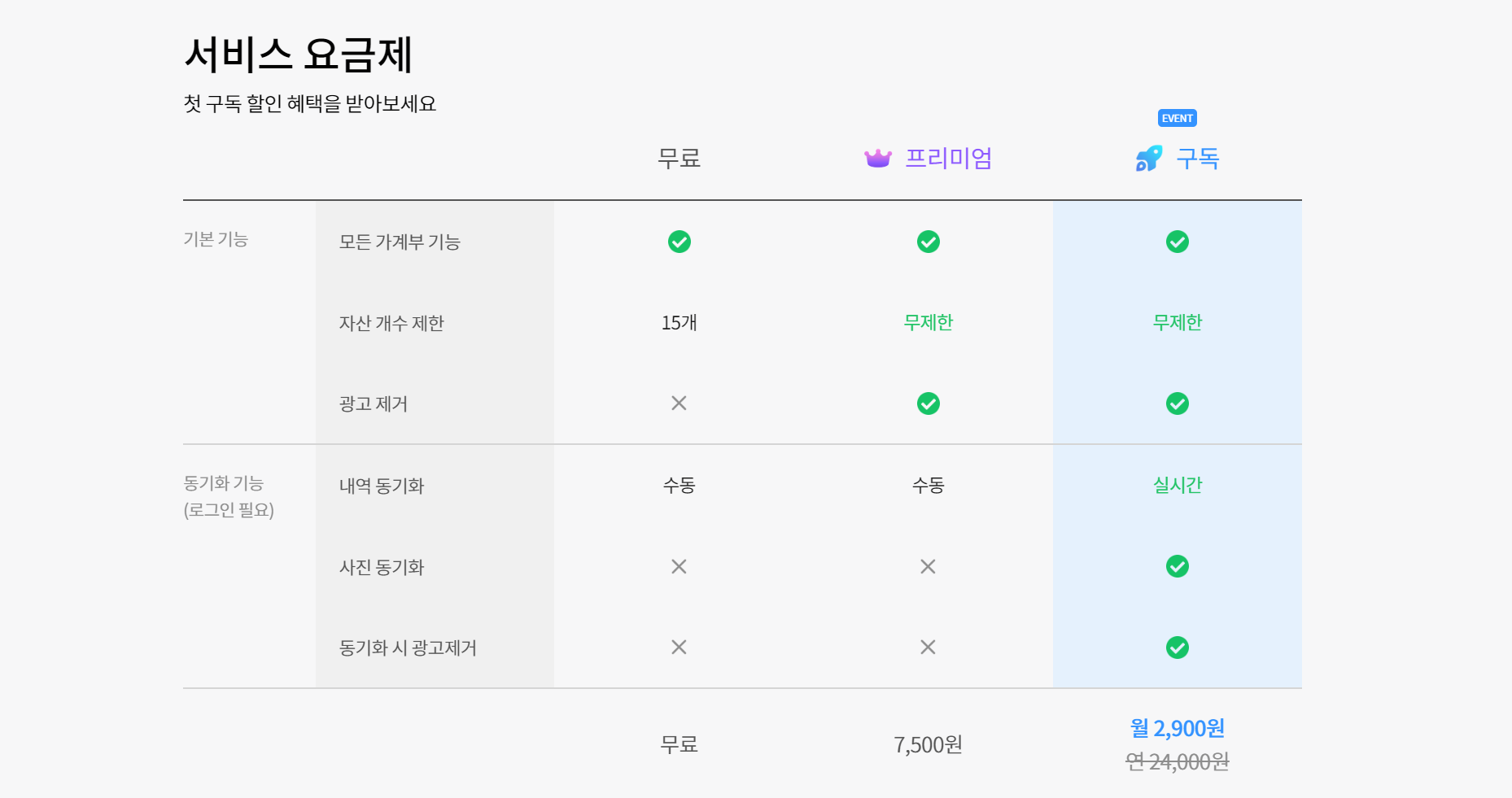 다만 앱 하단에 광고가 뜨고 자산 개수도 15개로 제한되는 등 제한이 있어 쓰다보면 유료 버전을 구매하고 싶게 되는데, 유료 버전으로는 광고와 자산 개수 제한이 해제되는 프리미엄과, 추가로 실시간 동기화와 사진 동기화를 지원하는 구독형 두가지로 나뉜다.