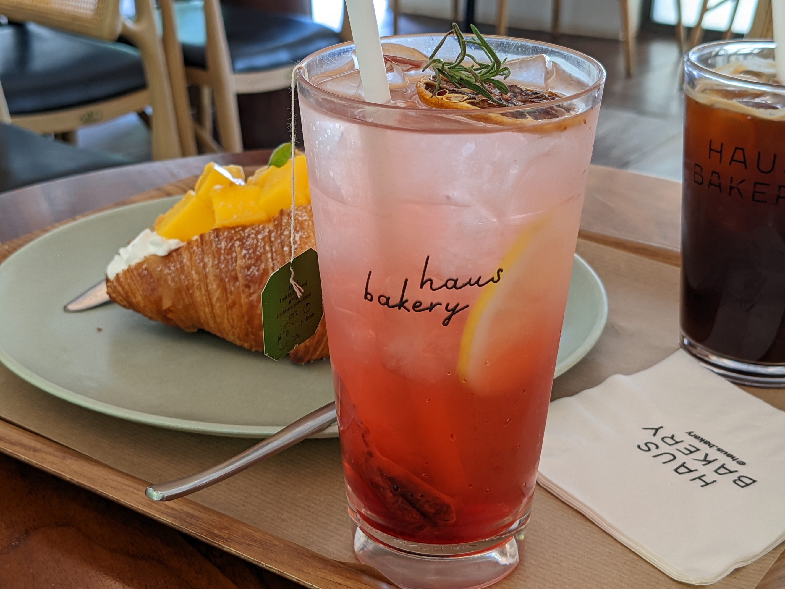 애플티, 아메리카노, 그리고 망고 크로아상을 주문했다. 빵이 유명한 집이다보니 다른 테이블들을 보면 빵을 1인 1~2개씩 사서 먹던데 우리는 배가 고프지 않아서 하나만 시켰다.