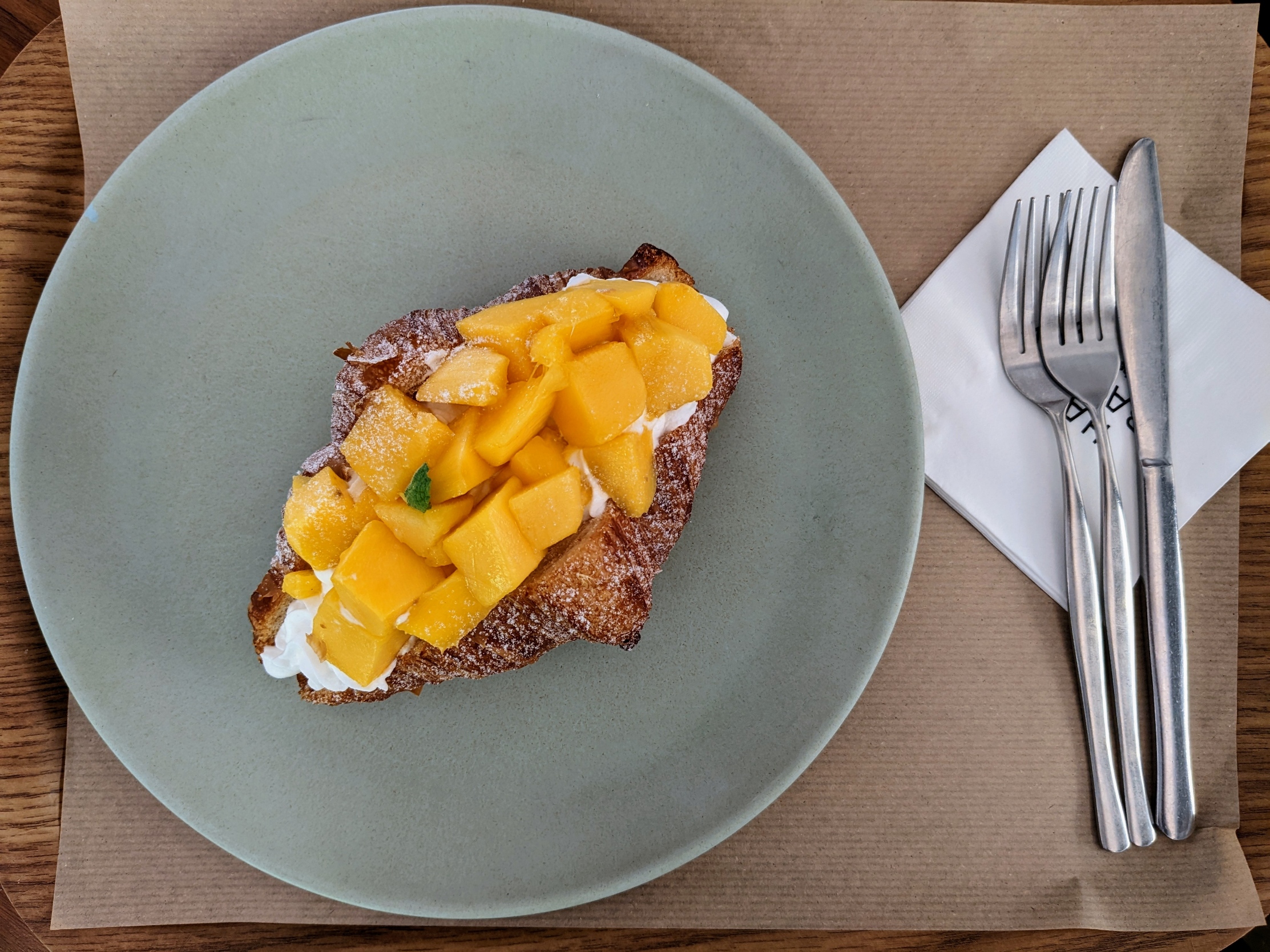 내부 사진을 찍는걸 까먹었는데, 빵 종류가 정말 많았다. 단팥빵, 크로와상, 치즈케익 등등. 음료 역시 커피부터 주스, 에이드까지 다양했는데 이 중 망고가 통으로 얹어져서 나오는 망고스무디가 이 집 메인 메뉴인듯.