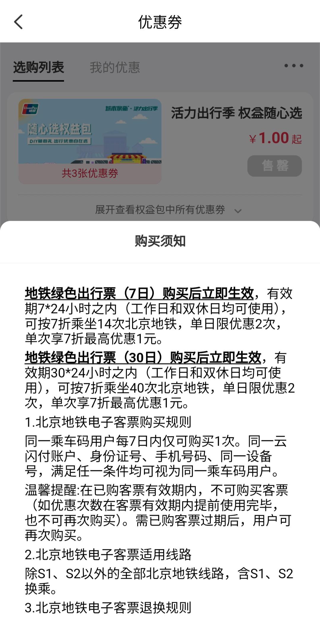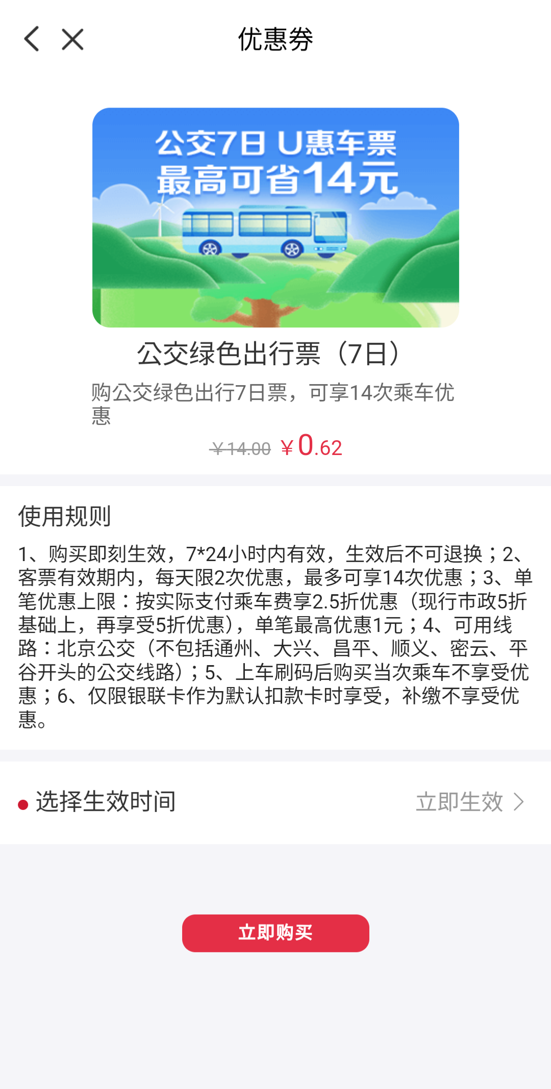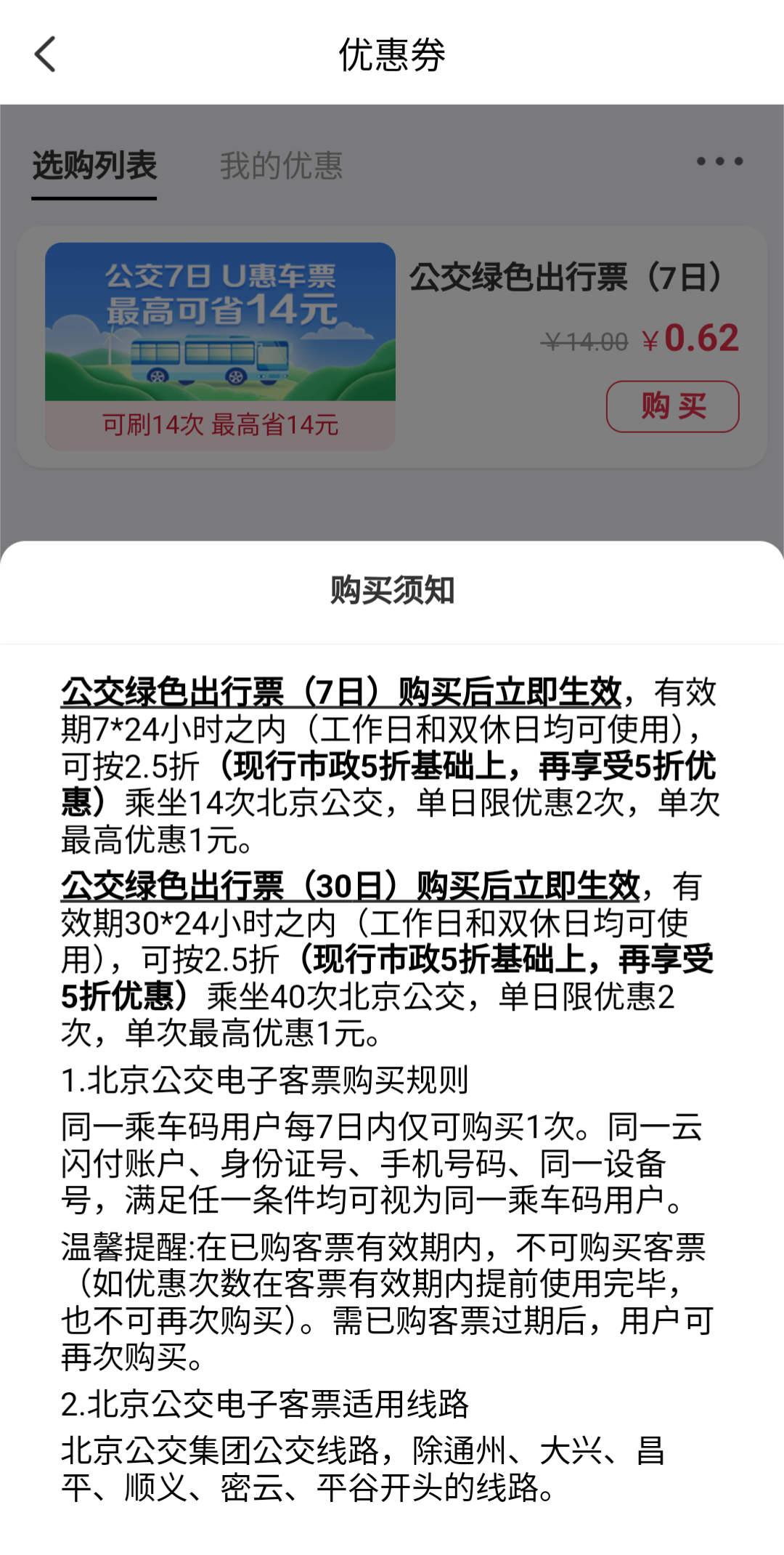 (베이징 버스는 기본요금이 현금 승차시 2위안, 교통카드 사용시 1위안이니까 할인권 적용하면 0.5위안만 차감되는거다. 즉 일주일에 버스를 2번만 타도 본전을 뽑을 수 있고, 매일 2회 기본요금 내 구간만 타고 다녀도 7위안이 절약되는 셈.)