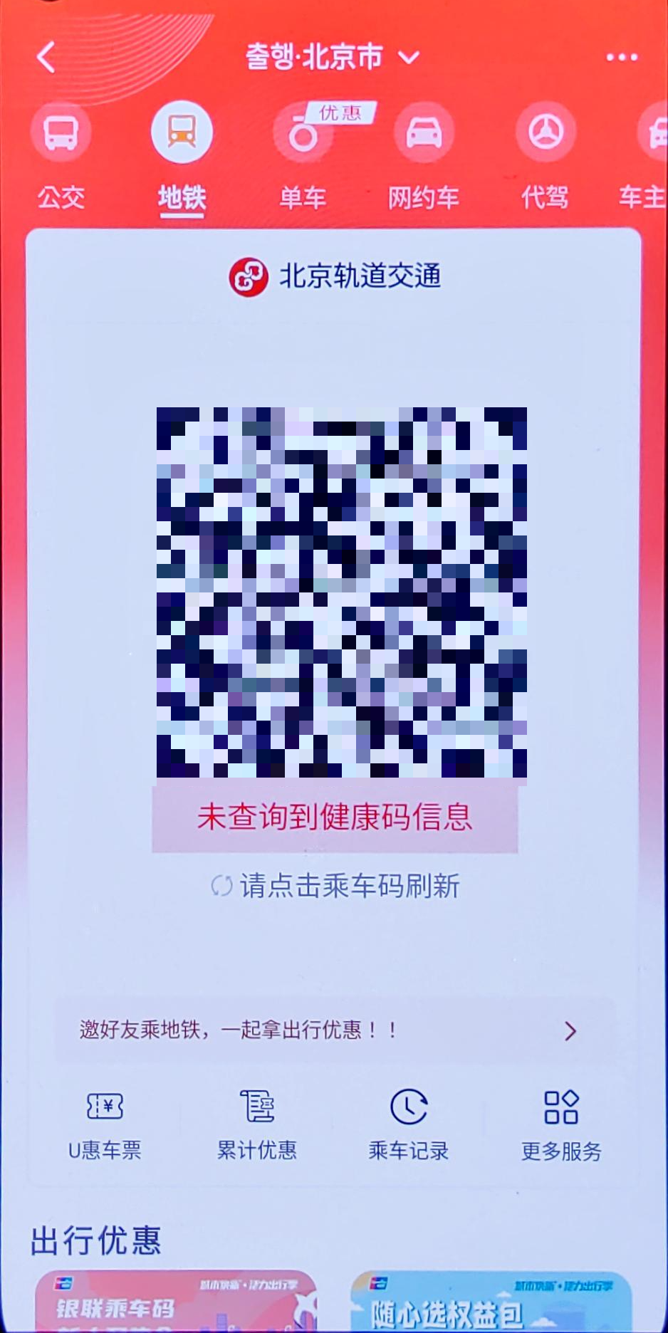로그인을 마치고 홈화면으로 들어왔다면, 맨 상단 두번째 버튼인 出行을 눌러 QR코드 버스/지하철 승차권 페이지로 들어와준다. 이제 이 QR코드를 버스 교통카드 단말기나 지하철 개찰구 스캐너에 갖다대면 교통카드 없이 버스/지하철 이용이 가능해진다.