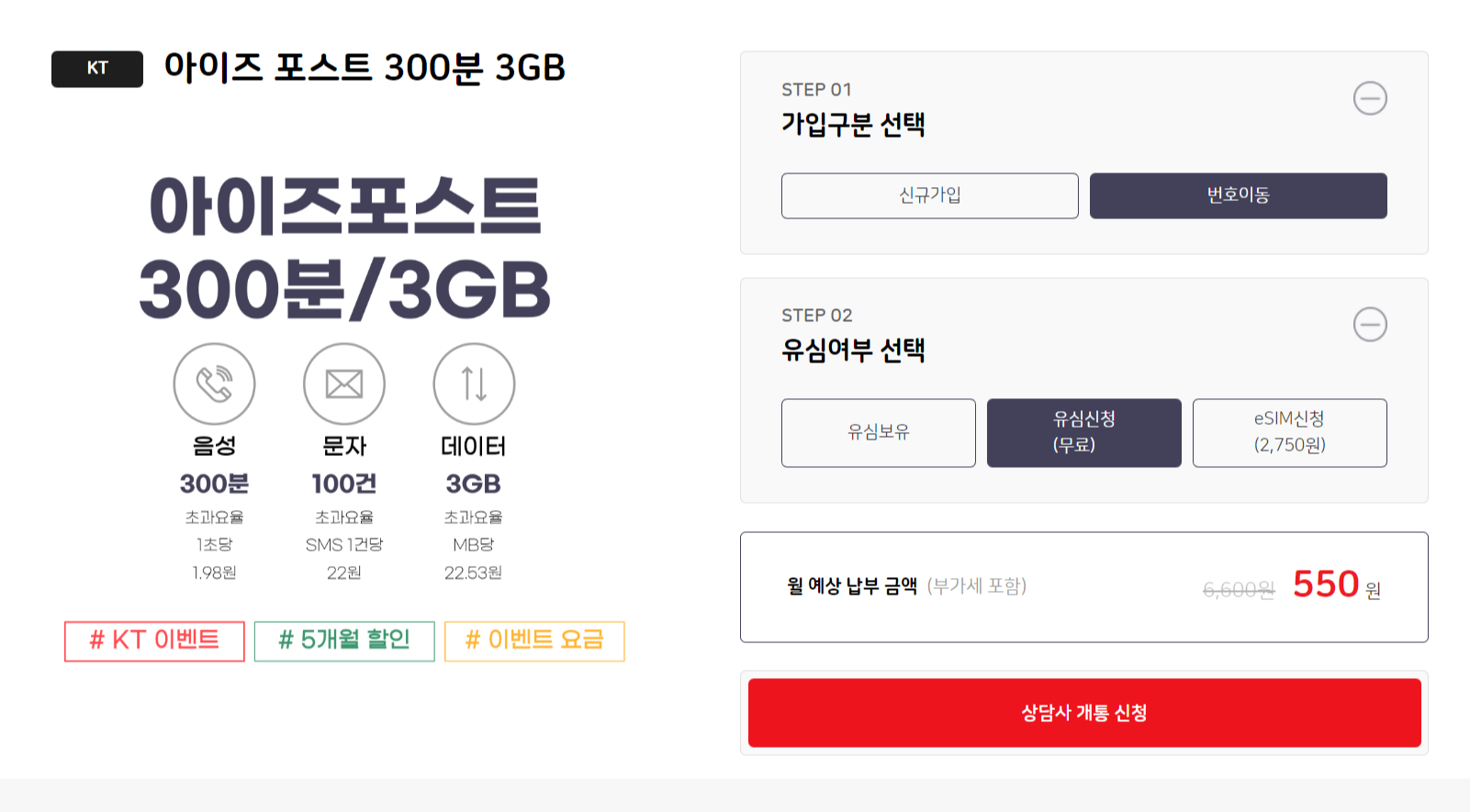 내가 선택한 요금제는 아이즈 포스트 300분 3GB. 다른 통신사에는 0원 요금제가 널렸지만 아이즈는 이게 제일 저렴해서 어쩔 수 없었다. 그나마 데이터량이 빵빵하니 메인 회선 데이터 소진 대비용으로 써먹어줘야지.