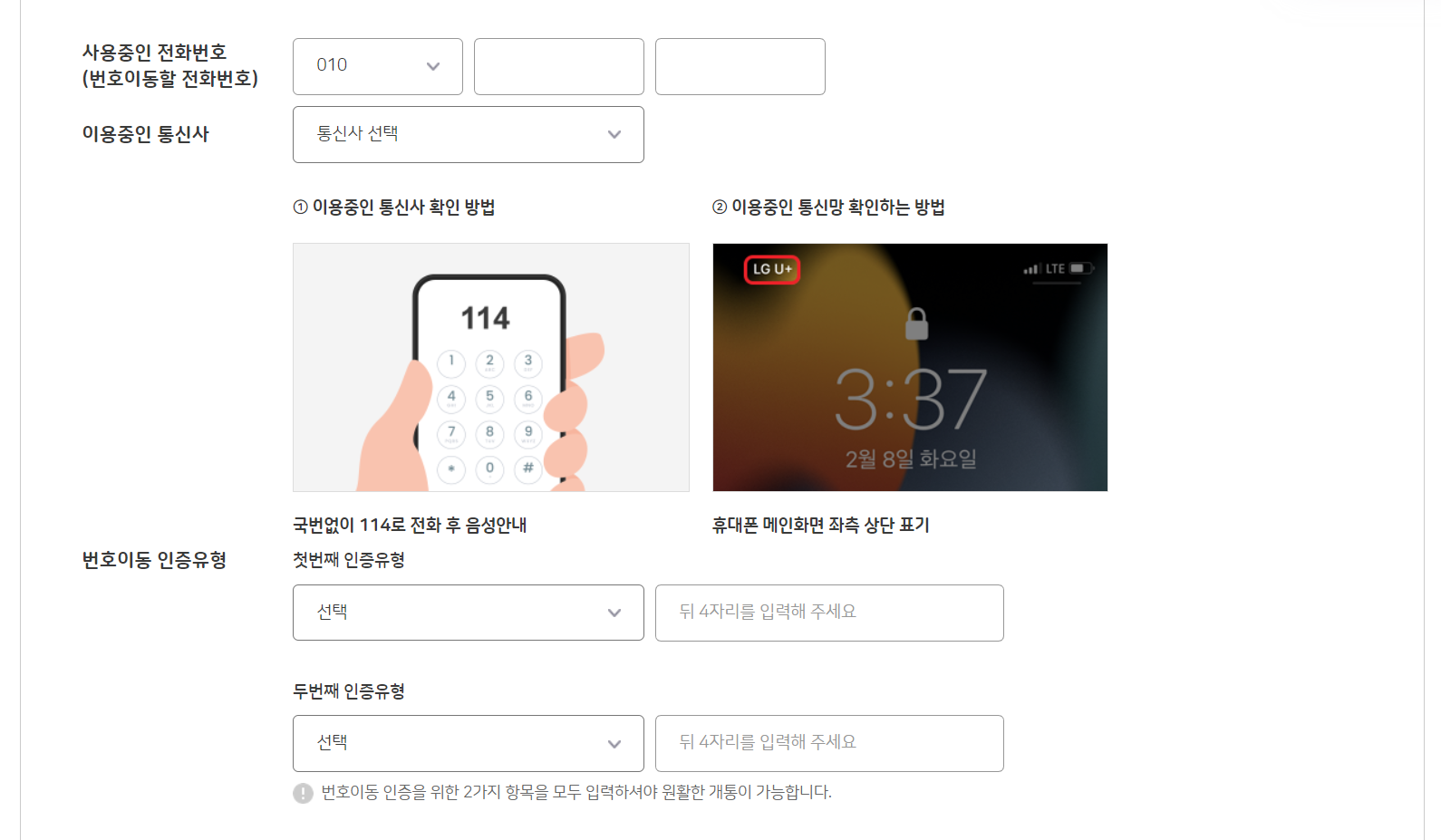나머지 가입 과정은 일반 유심과 똑같다. 특이하게 아이즈모바일은 번호이동 인증유형을 두가지를 써야하는데, 훼이크고 사실 하나만 써도 아무 문제 없이 다음 화면으로 넘어간다.