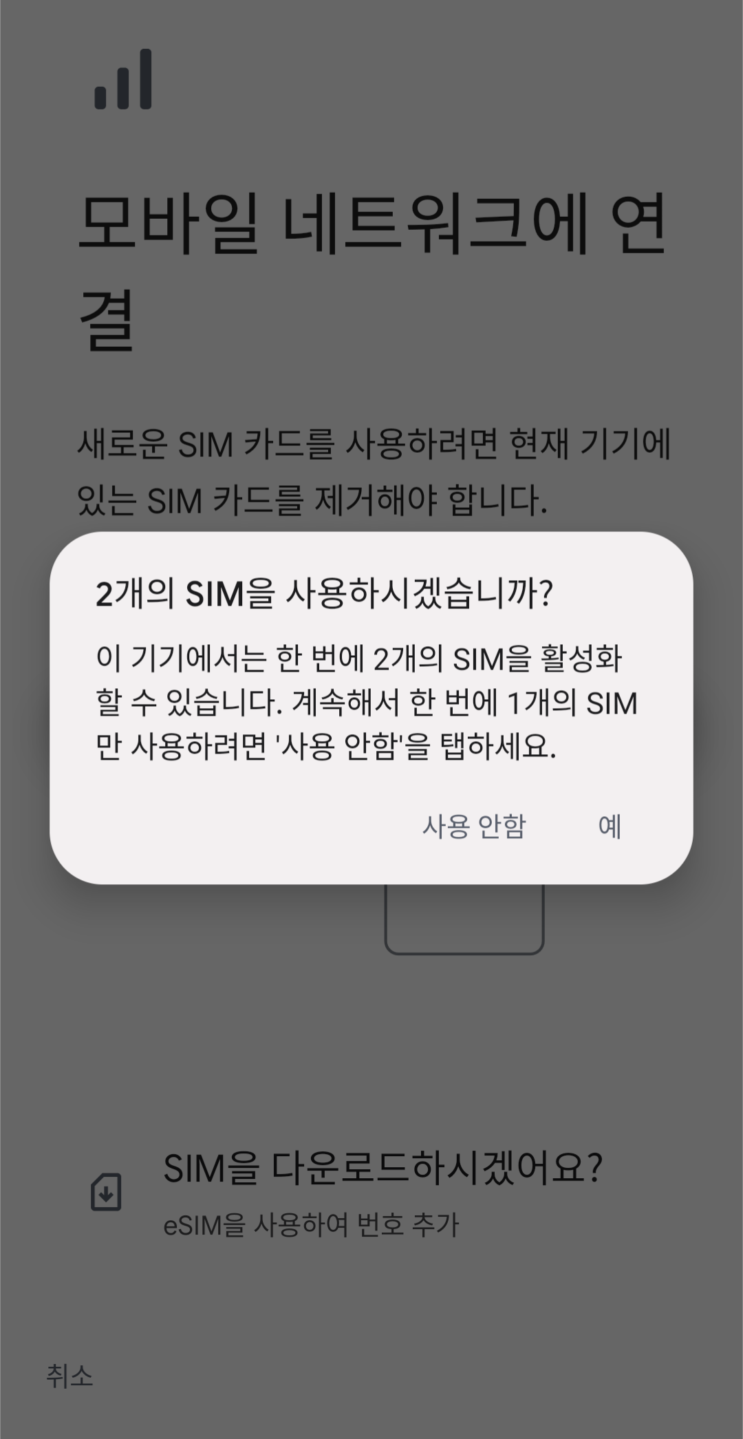 "설정 > 네트워크 및 인터넷 > SIM" 오른쪽의 "+" 를 누른 후 "SIM을 다운로드하시겠어요?" 를 누르면, 오른쪽 사진처럼 "2개의 SIM을 사용하시겠습니까?" 라는 확인창이 뜬다. "예"를 누르면 업데이트중이라는 로딩창과 함께 모든 네트워크가 끊기게 되는데, 일시적인 현상이니 당황하지 말자.