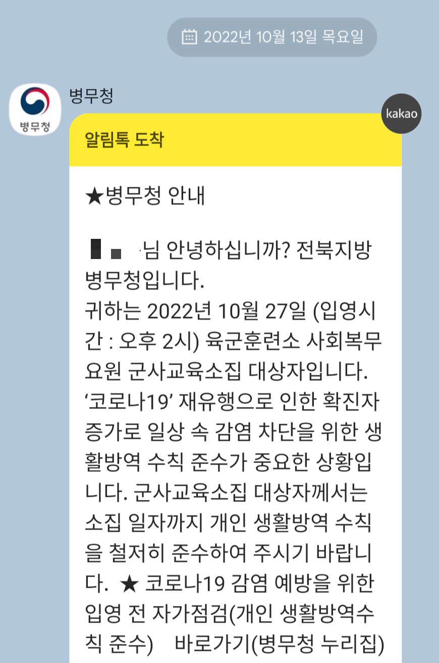 관심도 없는 산업기능요원 모집 관련 메시지를 시도때도 없이 보내던 병무청 알림톡이 약 1달 전부터는 드디어 입소에 필요한 중요한 공지들을 보내기 시작한다.