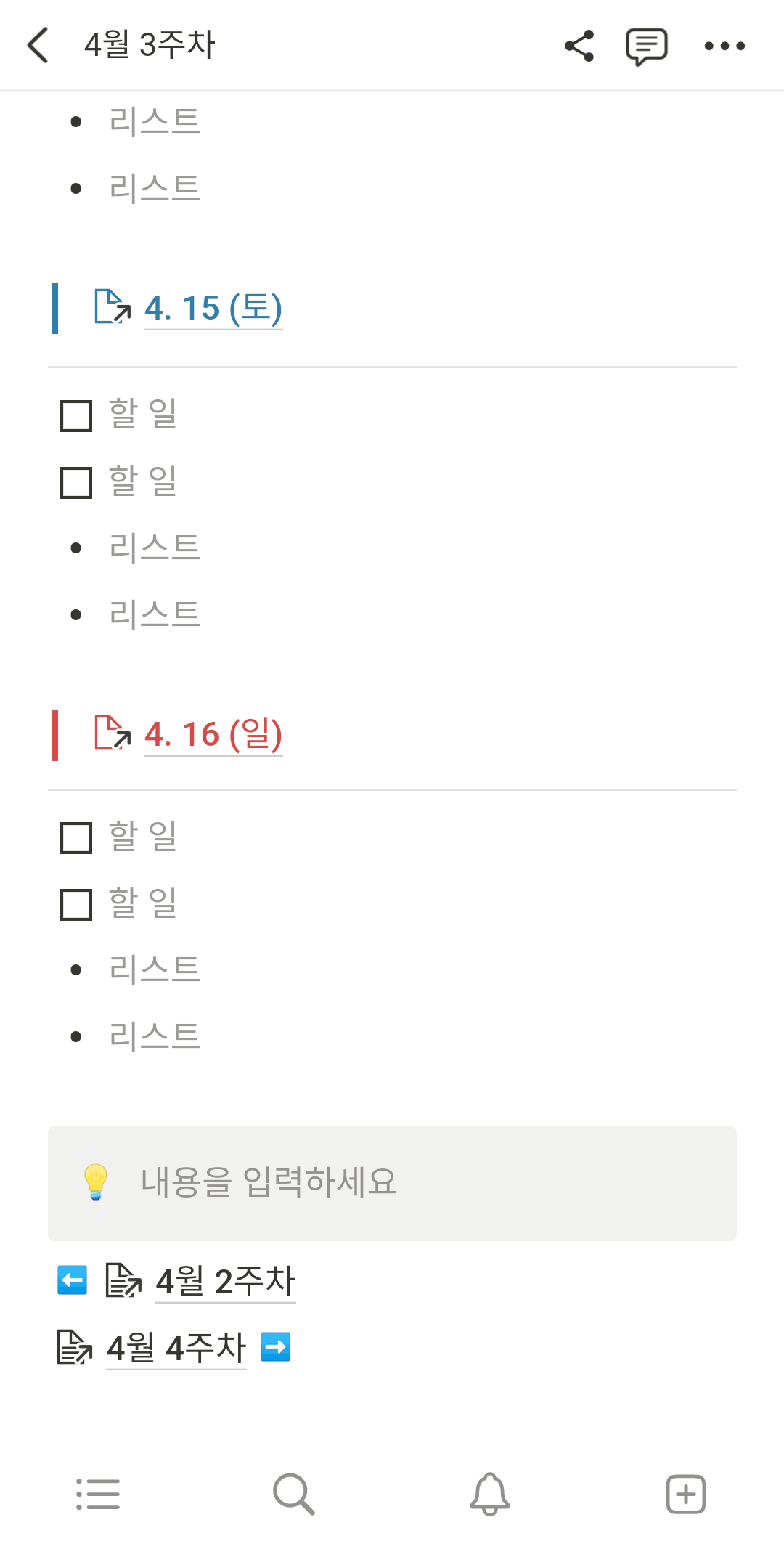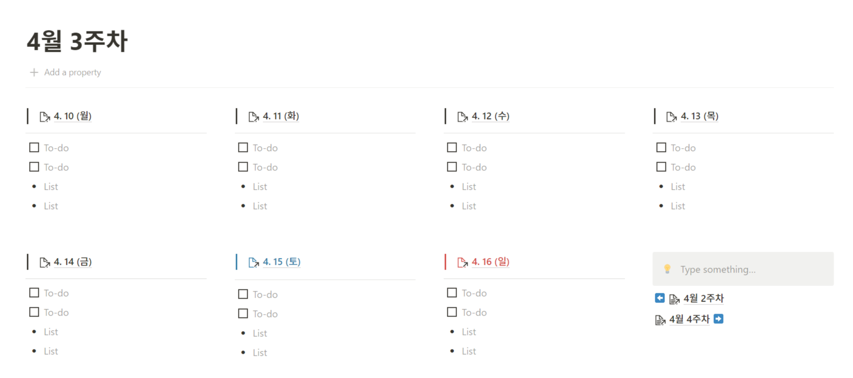 각 날짜 부분을 누르면 먼슬리 플래너 데이터베이스에 저장된 데일리 플래너로 연결됩니다. 맨 우측 하단에는 간단한 메모나 글귀를 적는 공간과, 지난주/다음주 플래너로 연결되는 링크가 있습니다.