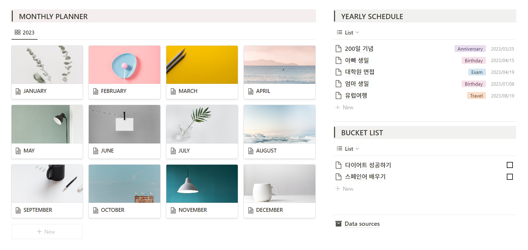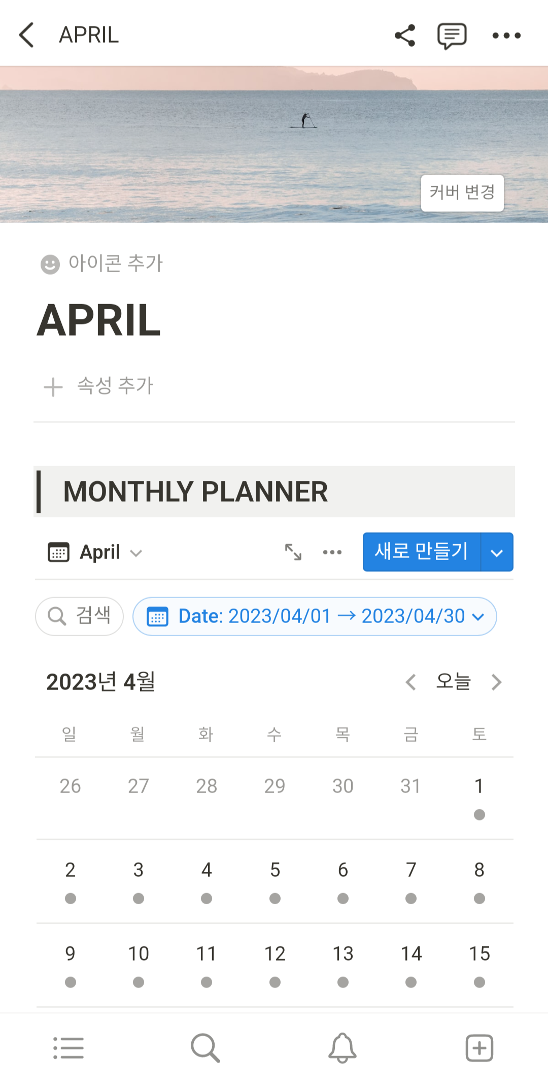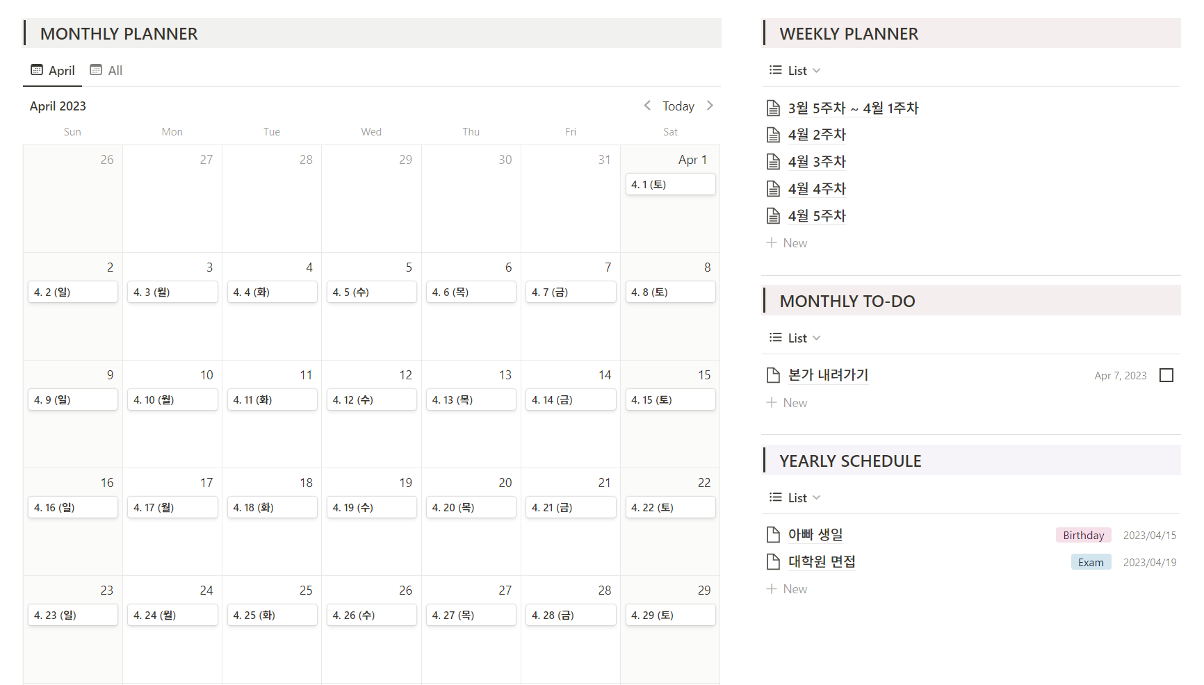- 달력: 데일리 플래너가 보관되는 데이터베이스입니다. 만약 달력 위에 일정이나 기념일을 추가하고 싶다면 위에 추가해도 됩니다. 월별 페이지마다 각기 독립된 데이터베이스가 아닌, 메인 화면의 "데이터 소스" 페이지 내 원본 데이터베이스를 링크 후 당월 일정만 표시되도록 필터링한 방식이며, 이전/다음달의 일정도 같이 보고 싶다면 좌측 상단 All 탭을 누르면 됩니다.