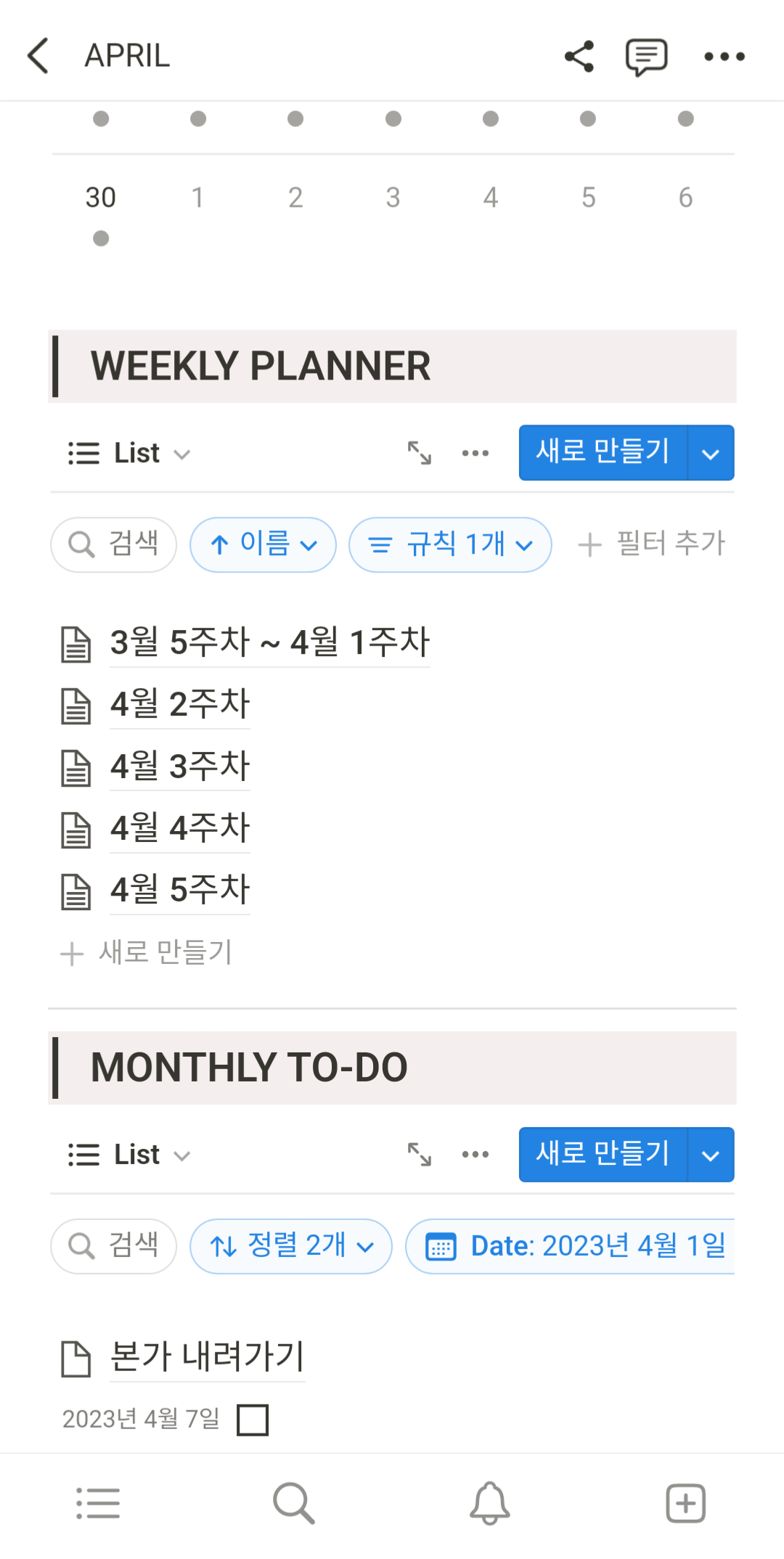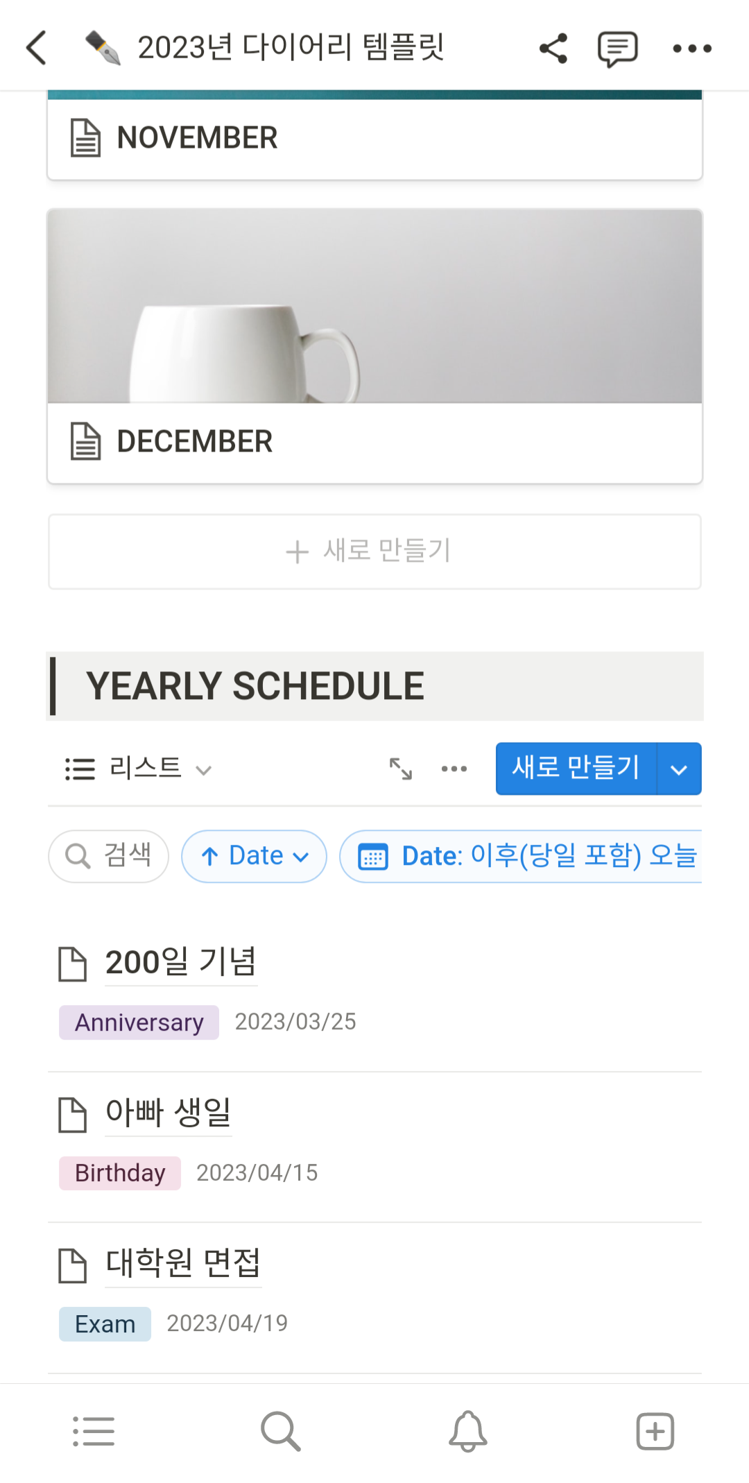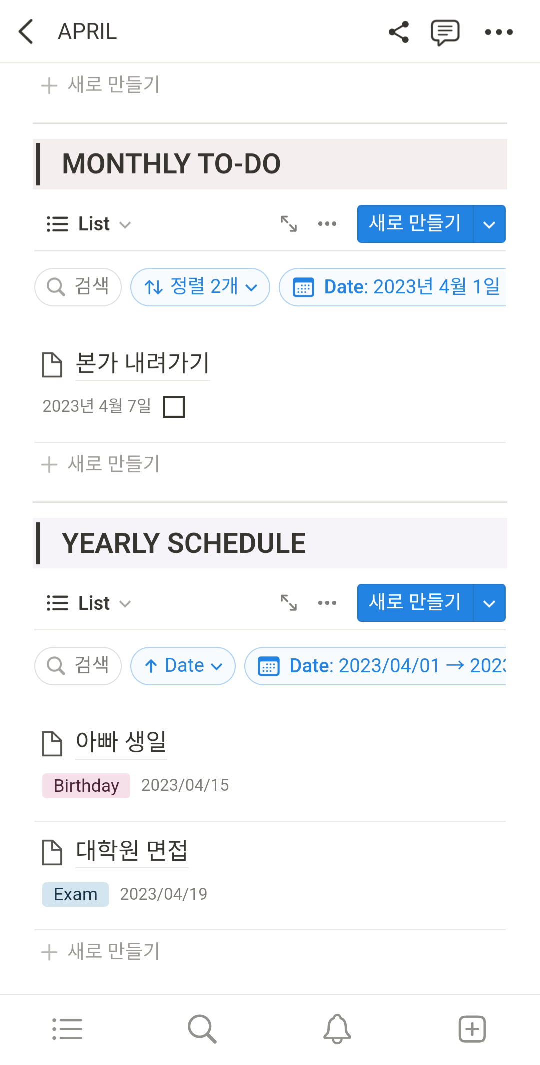 - 연간 일정: 메인 화면의 연간 일정 데이터베이스와 연결된 데이터베이스입니다. 월별 페이지마다 당월 일정만 표시되도록 설정되있습니다.