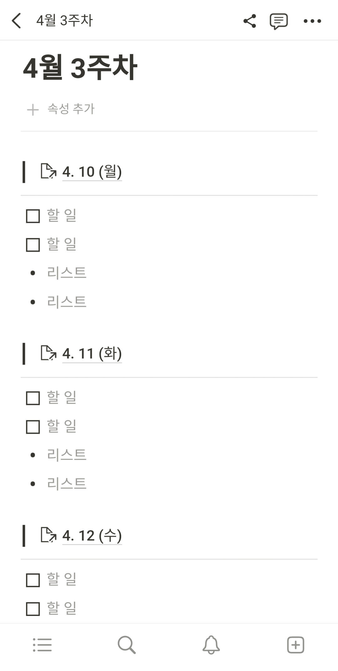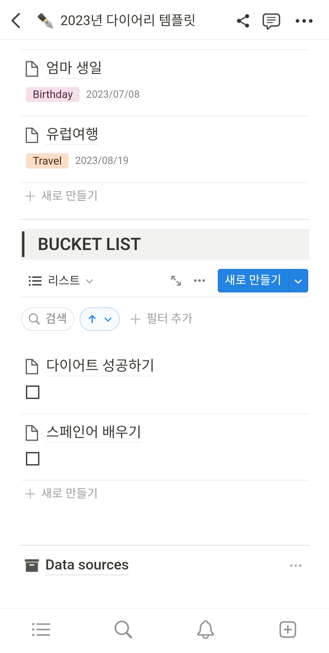 - 버킷 리스트: 말 그대로 새해 다짐을 적는 곳입니다. 만약 "달성"의 기준이 애매하다면 체크리스트 속성을 삭제해서 사용하면 됩니다.