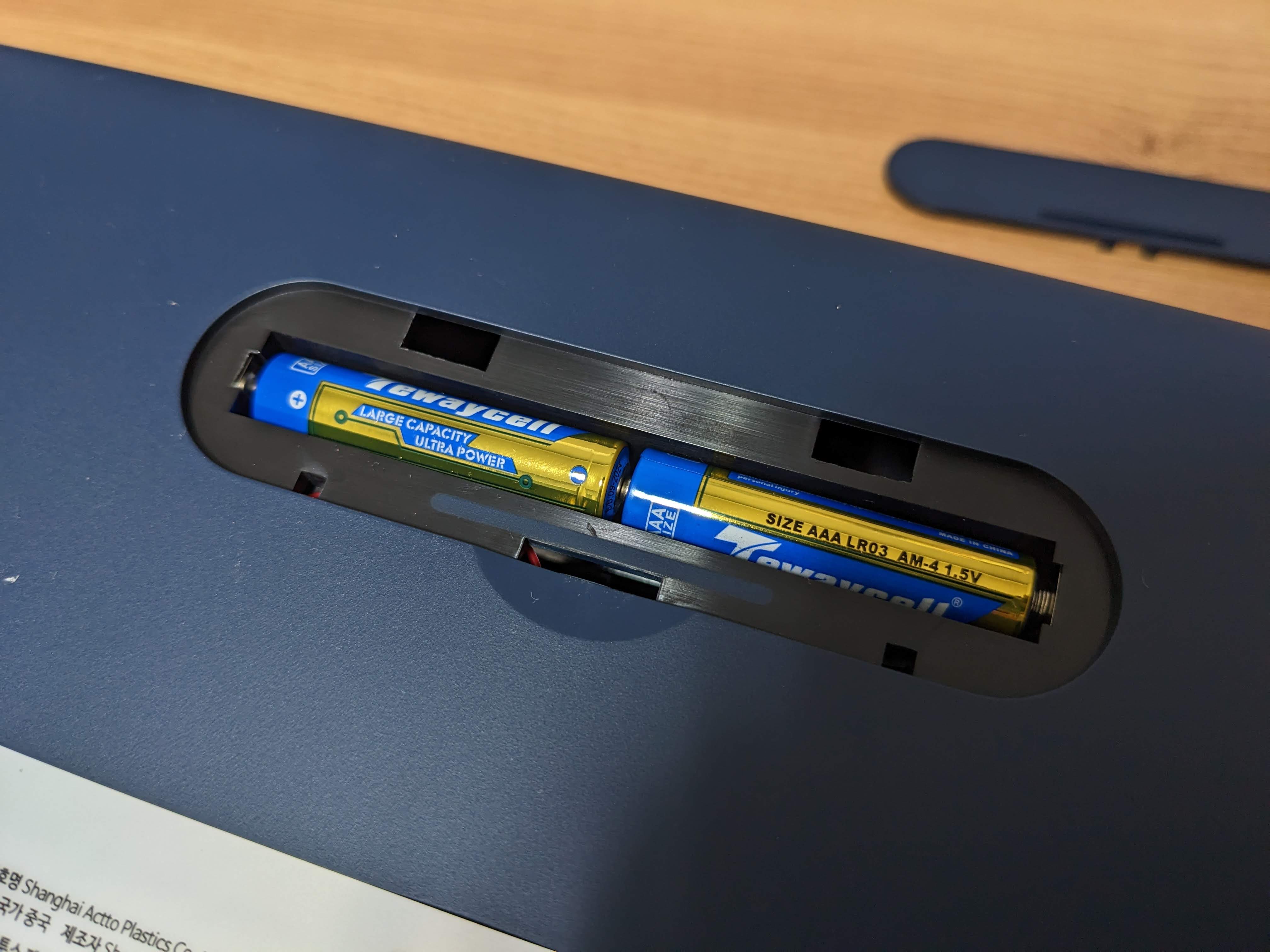 건전지 교체 방식으로, AAA 건전지 2개를 넣으면 된다. 개인적으로 충전식을 선호하기는 하는데... 뭐 배터리 수명 줄어들 걱정할 필요 없고 나름의 장점도 있긴 한듯.