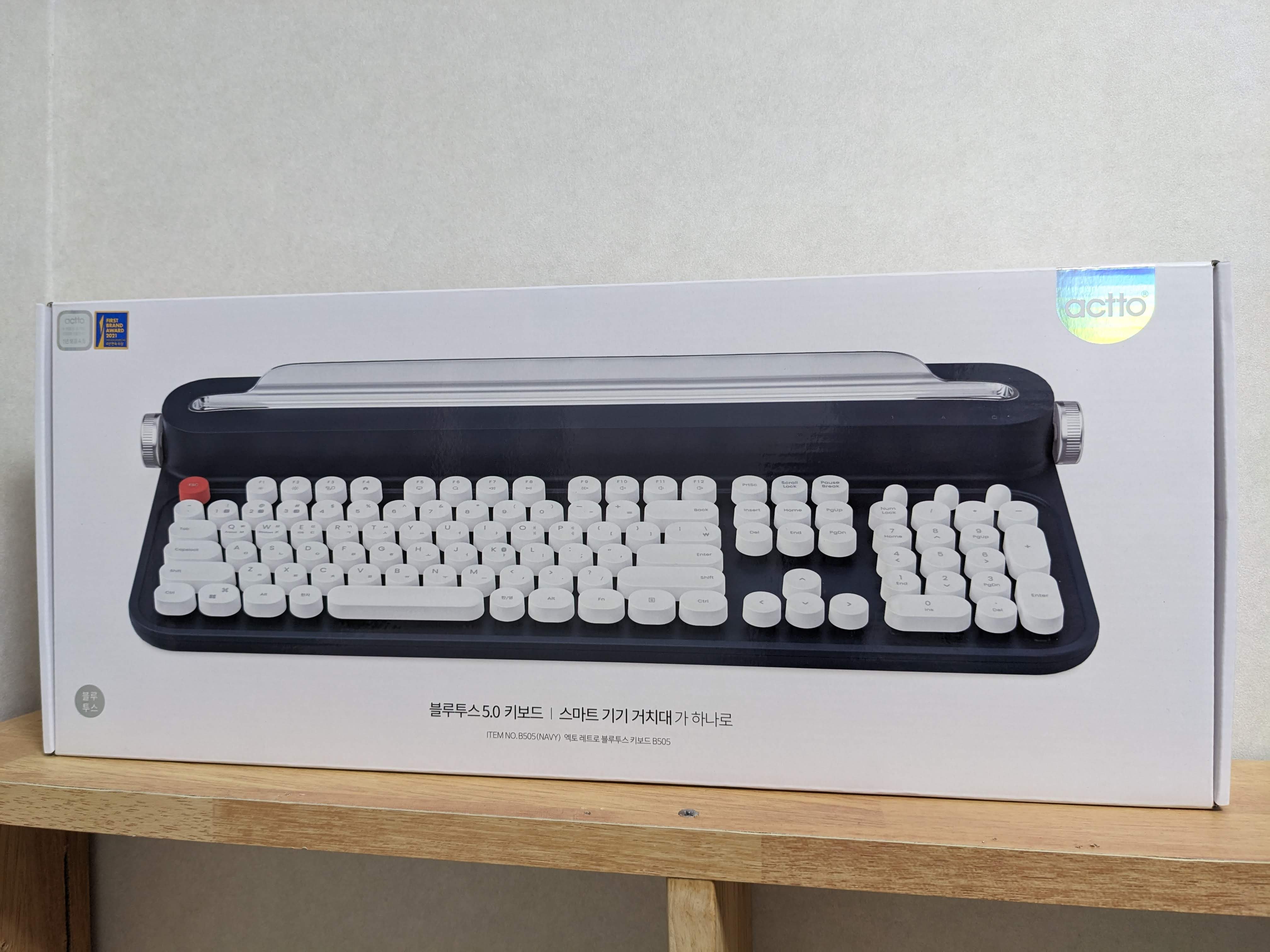 블루투스 풀사이즈 키보드는 B503과 B505 두 종류의 모델로 나뉘는데, B503은 둥글둥글한 옛날 타자기 외관에 가깝고 B505는 각지고 심플한 디자인이다. B505가 개인적으로 좀 더 마음에 들어 이걸로 구매했다.