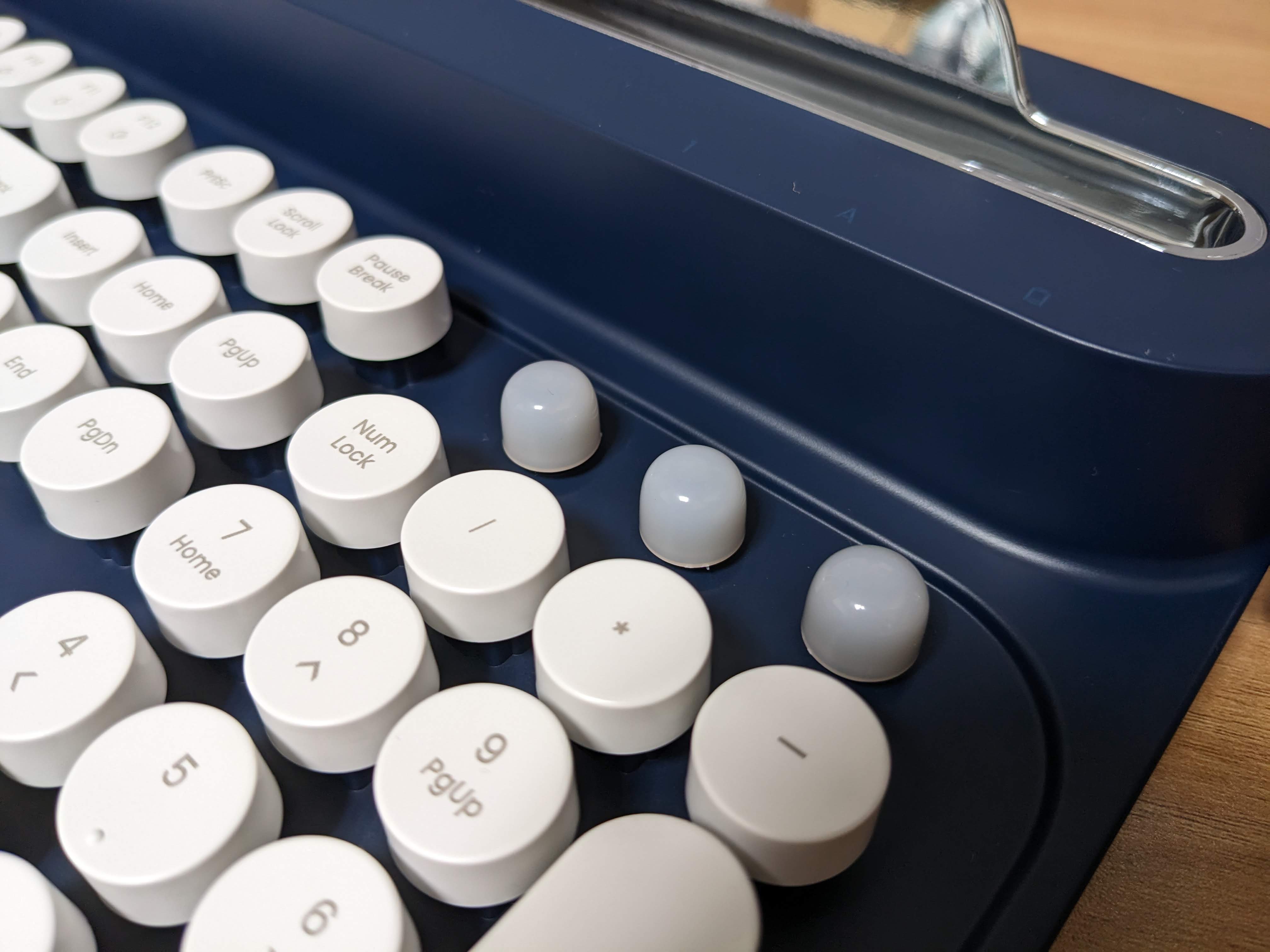 오른쪽 숫자 키패드 위에는 Num Lock, Caps Lock, 배터리와 페어링 상태를 보여주는 LED 표시등.