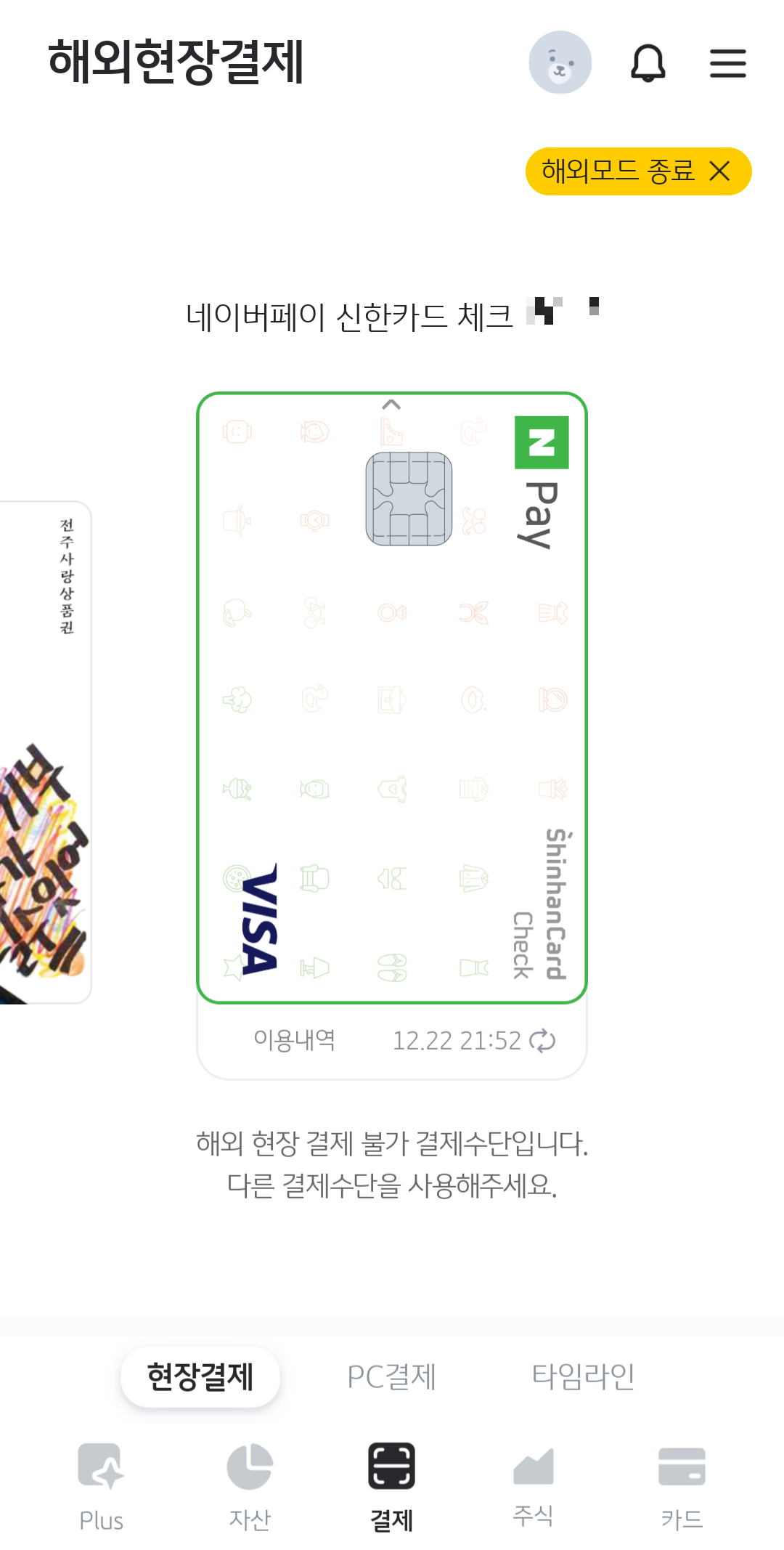 일반 오프라인 결제는 되지만, 해외현장결제 기능은 해외사용이 가능한 카드임에도 아직까지 지원하지 않는다. 자주 사용하지는 않는 기능이지만 막상 안되니 아쉽다.