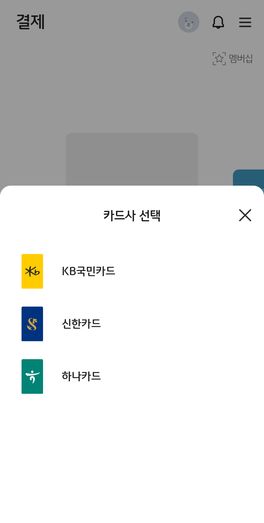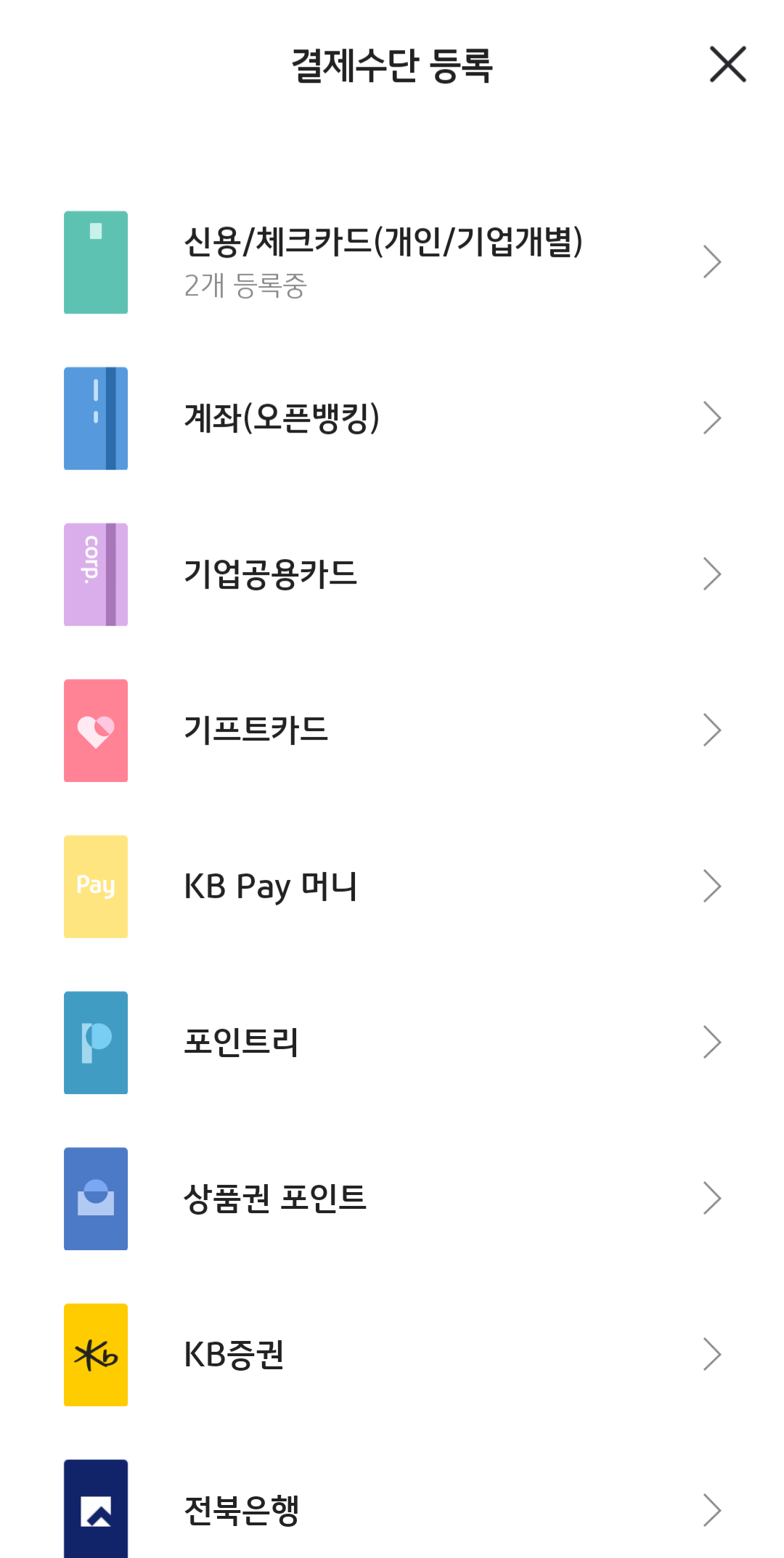 KB Pay 앱 결제 탭에서 가장 왼쪽으로 넘기면 나오는 결제수단 등록 버튼을 눌러 "신용"체크카드"를 선택하면, 국민/신한/하나카드 중 하나를 선택하는 메뉴가 새로 생긴걸 확인할 수 있다. 여기서 본인이 등록할 카드사를 선택한다.