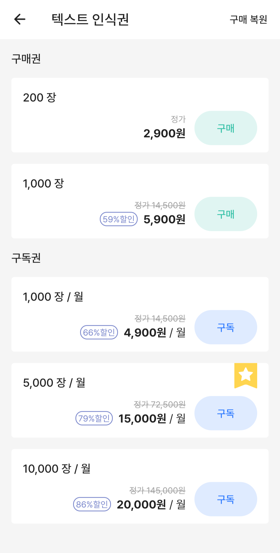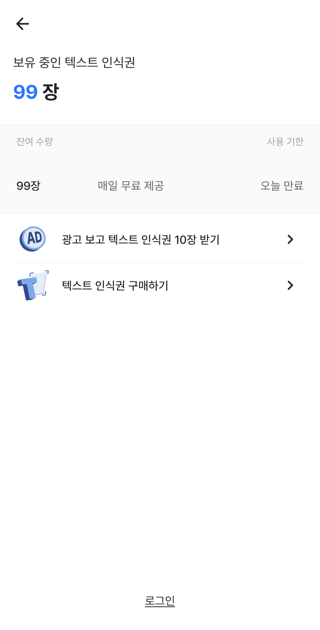 다만 스캔 기능은 무료인것과 다르게 OCR은 매일 100장 무료, 그 이상은 추가로 인식권을 구매하거나 월 구독권을 구독해야하는 유료 기능이다. 그래도 강제 인앱광고도 없고 매일 무료로 100장이나 준다는 점을 감안하면 이정도 가격은 충분히 합리적이라고 생각한다.
