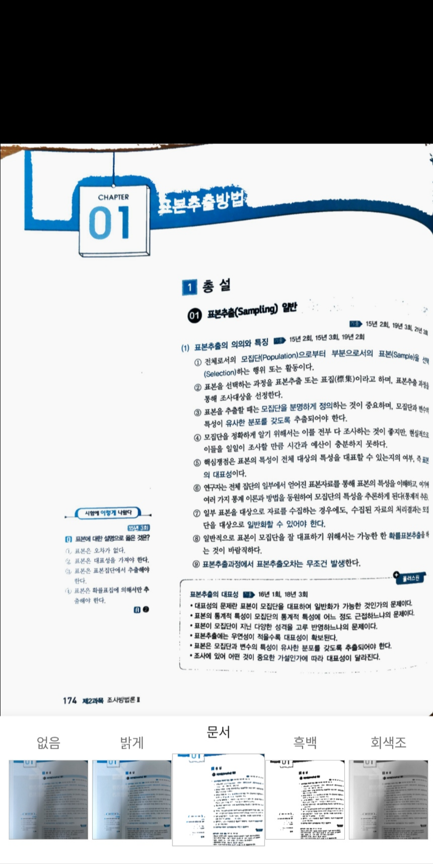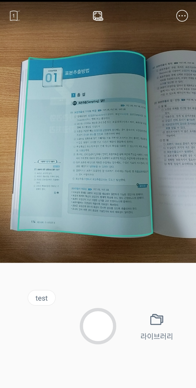 vFlat에서 책을 스캔한 모습. 두꺼운 자격증 수험서라 굴곡이 심하지만 어플에서 휘어진 부분을 제대로 인식해서 스캔 결과물에는 평평한 종이를 스캔한듯 왜곡이 거의 없다.