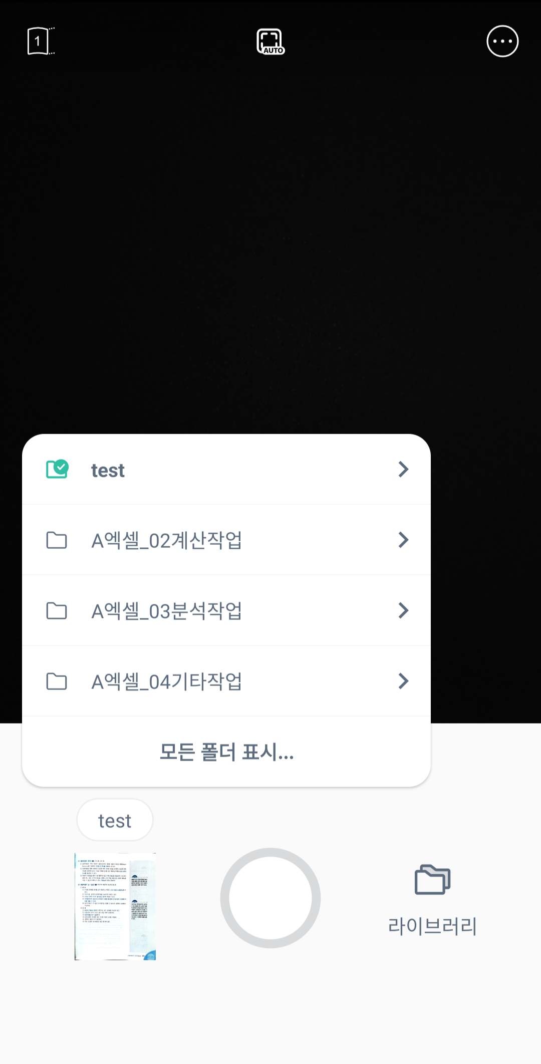 vFlat이 마음에 드는 또 다른 이유는 바로 폴더 관리가 편리하다는 점이다. 메인 화면 셔터 버튼 오른쪽의 "라이브러리"에 들어가면 이전에 스캔했던 스캔본들을 관리하는 창이 뜨는데, 여기서 새 폴더를 생성하여 파일들을 이동할 수 있다.