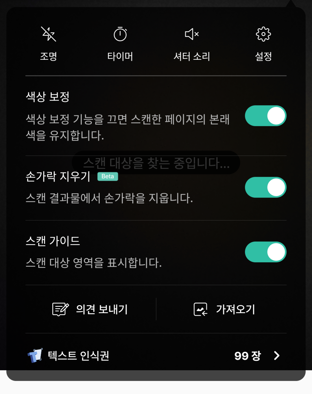 두번째는 스캔 결과물에서 손가락을 지워주는 기능이다. 책을 스캔할때는 손가락을 책 가장자리에 누른채 스캔하는 경우가 많은데, 이 기능을 켜면 손가락을 자동으로 지워준다. 다만 아직 베타 기능이라 완벽하게 작동하진 않는데, 특히 두 손가락으로 누른 상태는 잘 인식이 되지 않는듯 했다.
