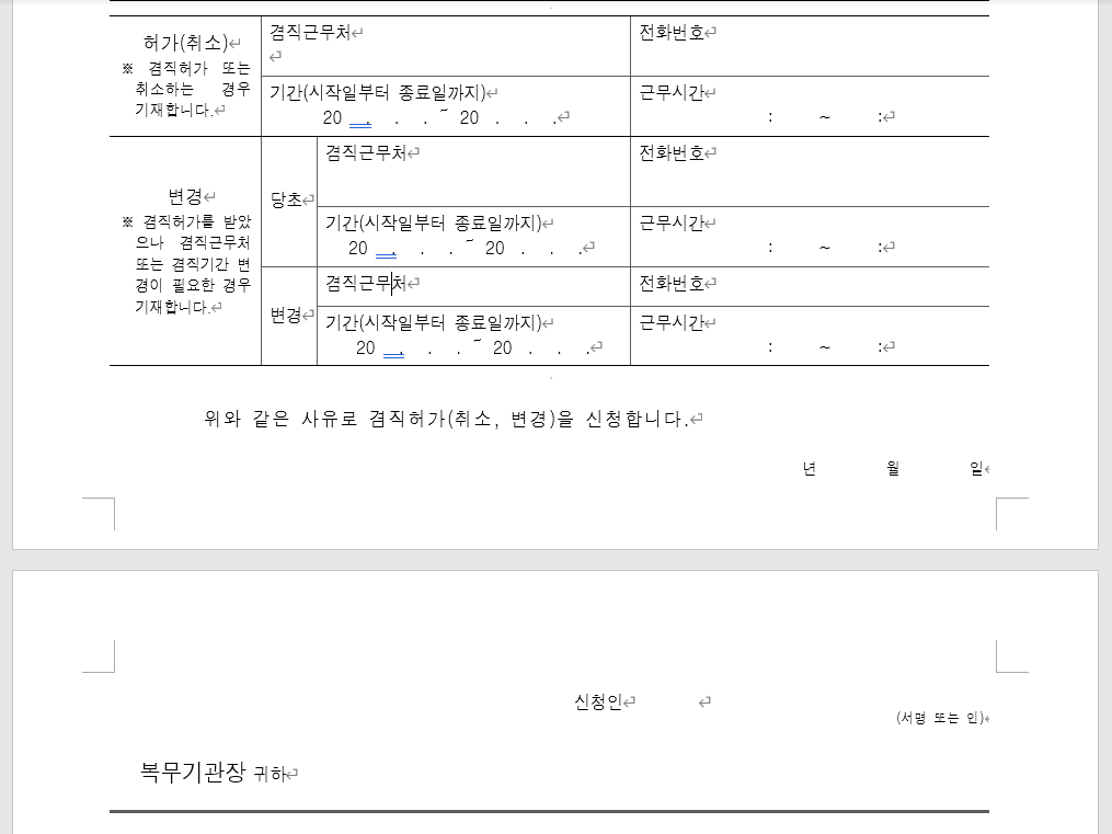 마지막으로 "복무기관장 귀하" 부분을 "(본인 근무지명)장 귀하"로 변경하고 (이 역시 어떻게 적어야할지는 담당자한테 물어보면 된다), 프린트하여 서명 후 제출하면 나머지는 담당자가 알아서 처리할거다.