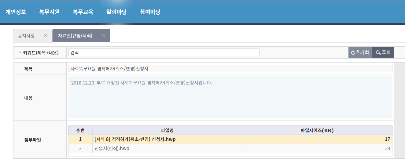 담당자의 구두허락을 받았으면 겸직허가 신청서를 작성해서 제출해야한다. 사회복무포털 자료실에 들어가서 겸직이라고 검색하면 나오는 서식8 파일을 다운로드받는다. 만악의 .hwp