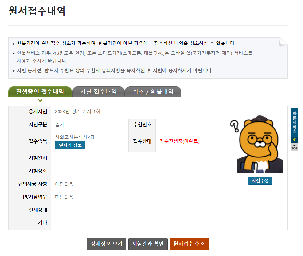사전접수 유의사항에서도 수차례 강조했겠지만, 사전접수를 완료했더라도 반드시 접수 당일에 시험장소 선택과 결제를 완료해야만 접수처리가 된다. 쉽게 말해 사전접수는 응시 정보 일부를 미리 입력해놓음으로써 접수 당일 서버 대기하면서 허비할 시간을 일부 생략해줄 뿐이지, 디즈니랜드 패스트트랙마냥 원서접수할때 서버 우선권을 부여하는 서비스가 아니다.