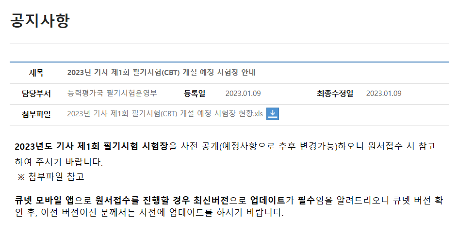 하지만 시험 응시 전에 시험장 정보를 미리 찾기가 좀 어렵게 되어있는데, 이번 2023년 1차 시험 기준으로 시험 장소는 접수 전날 홈페이지 공지사항에, 시험일정(그마저도 날짜만 있고 시간은 없음)은 시험 당일 업데이트된 원서접수 관련 안내사항 파일에서 찾아볼 수 있었다. 원서접수 시작 전에 미리 큐넷 홈페이지에서 시험시간, 시험장 관련 공지사항이 새로 올라온게 있나 한번 더 확인하고, 이에 맞게 일정 계획을 세우는걸 추천한다.