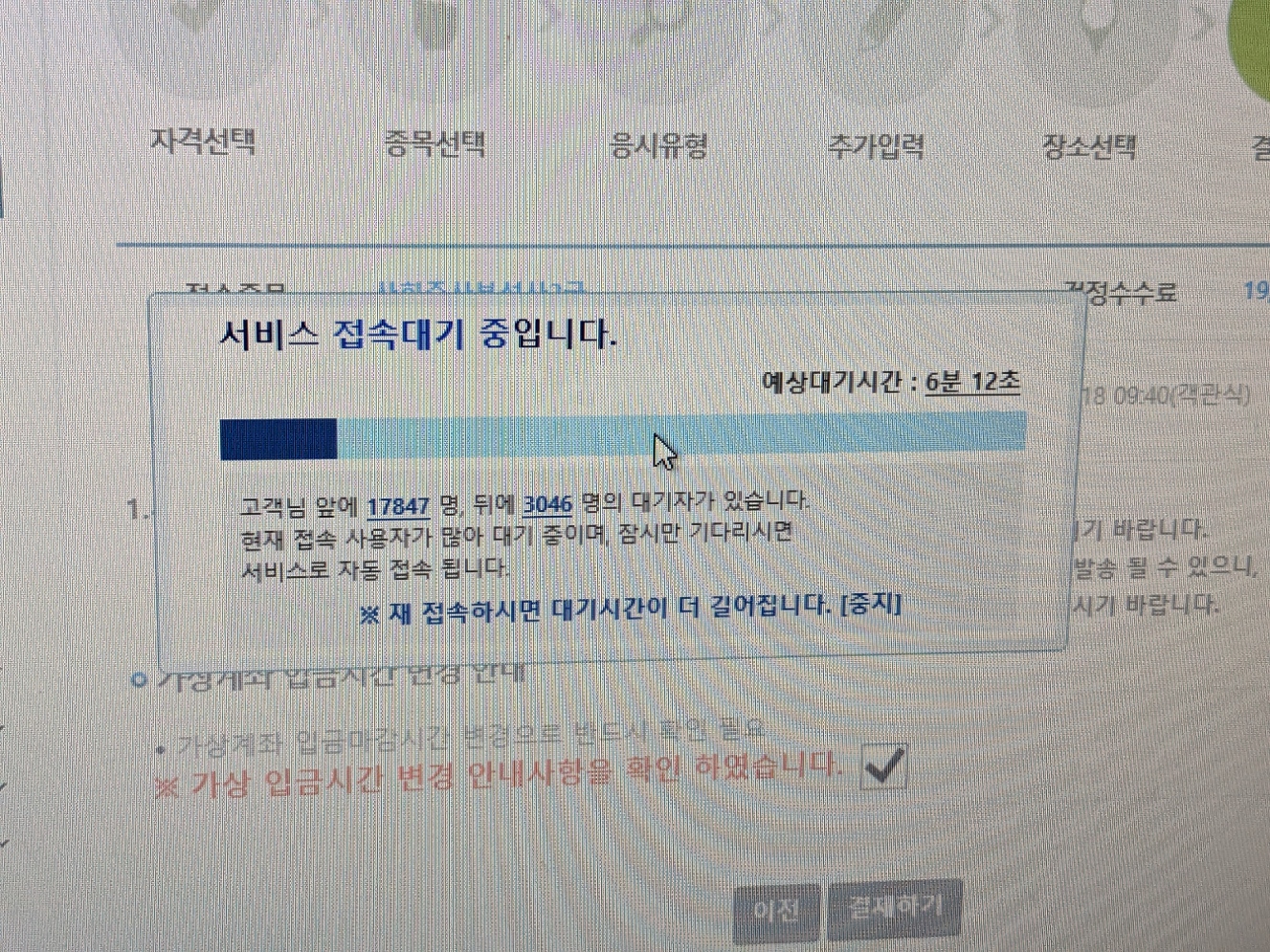 처음에는 컴퓨터보다 휴대폰 큐넷 앱에서 접수에 성공할 확률이 높다고 들어 휴대폰에서만 원서접수 대기를 타고 있었는데, 막판에 혹시 어떻게 될지 몰라 컴퓨터에서도 로그인을 해놓았다.