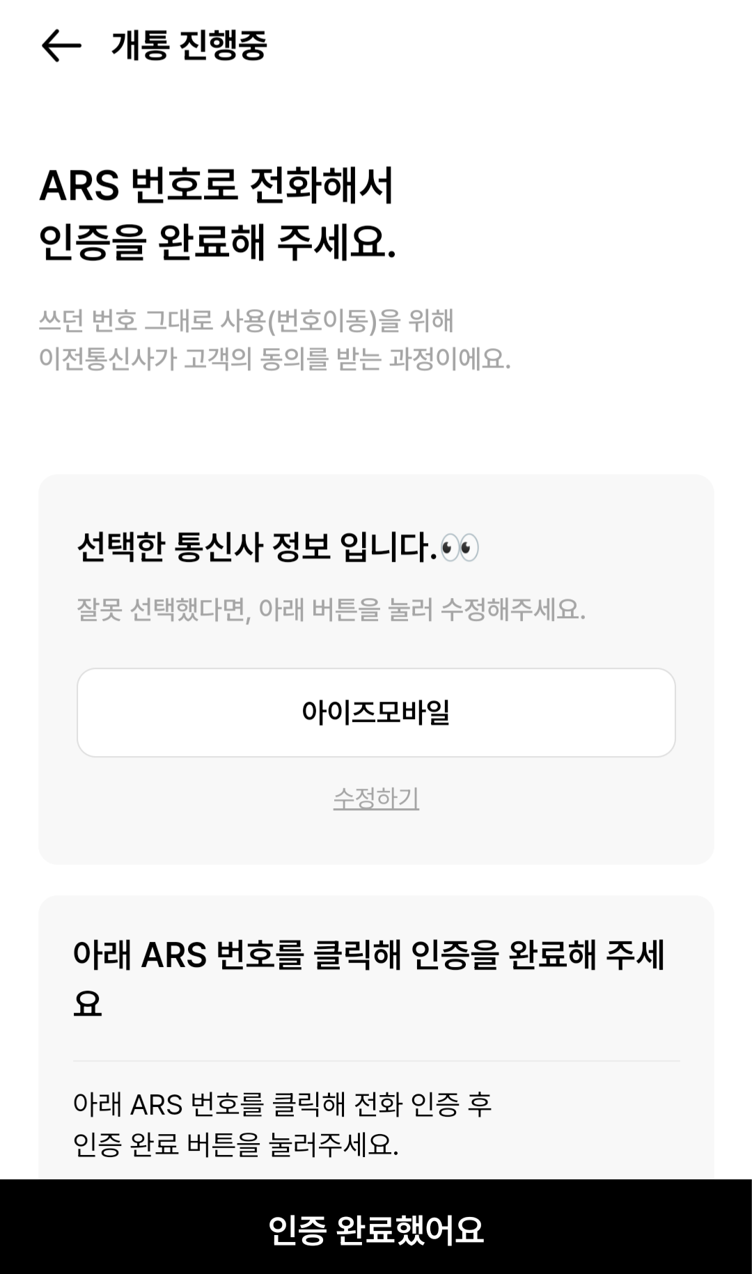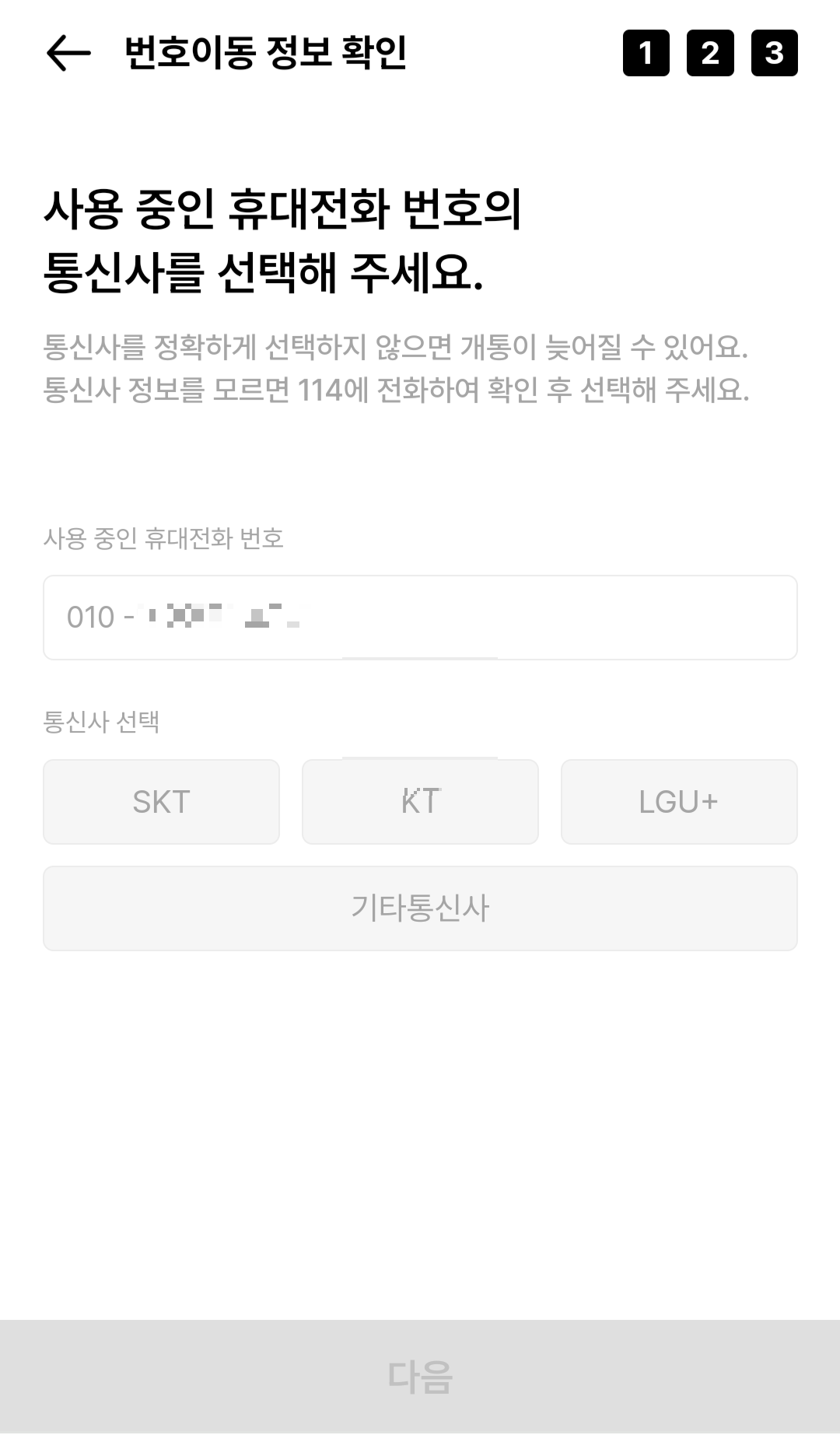 마지막으로 ARS를 통해 전 통신사에서 번호이동 사전동의를 진행해주고, 휴대폰 정보 입력 단계에 들어온다.