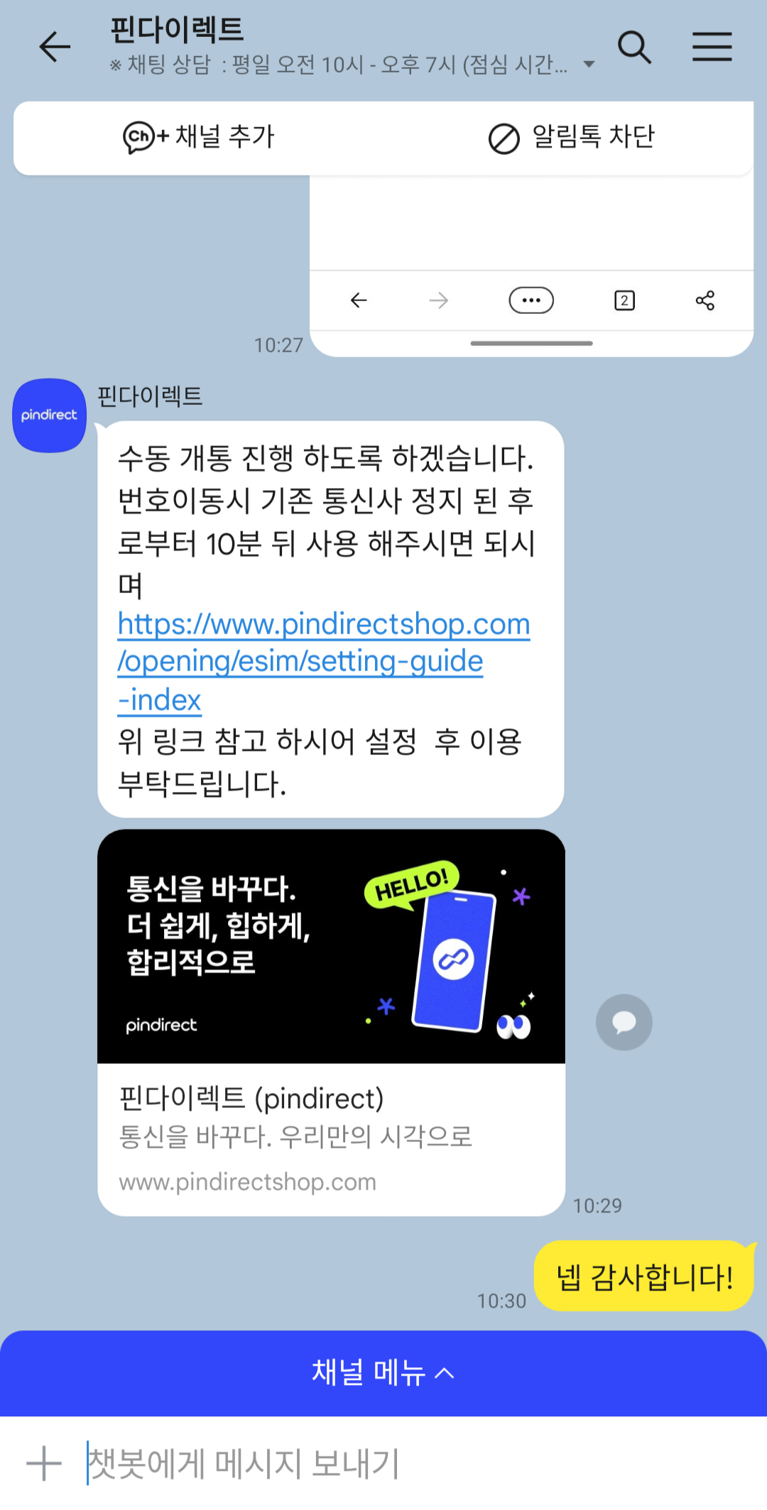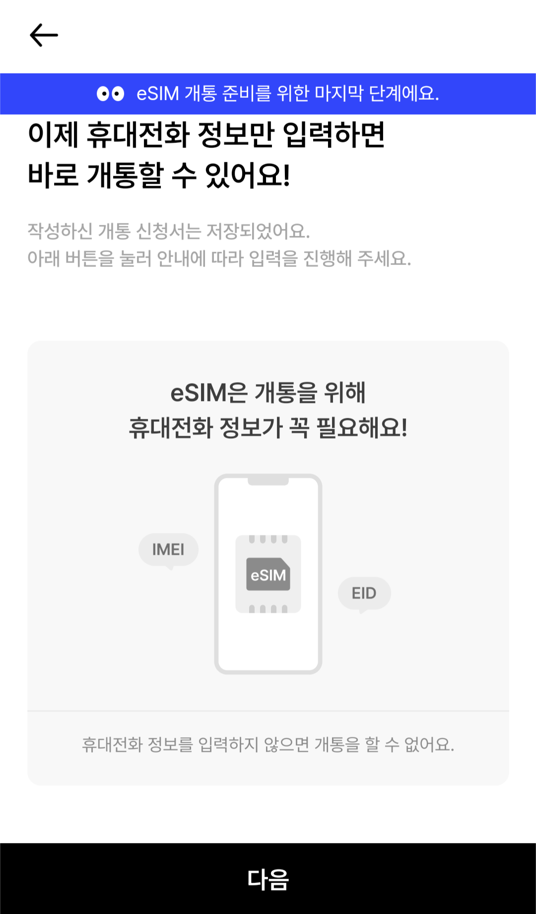 다시 상담원에게 문의했더니 수동 개통을 진행하겠다는 안내를 받았다. 잠시 기다렸더니 휴대폰 상태 표시줄에 두번째 안테나가 꺼졌고, 링크를 타고 들어가 개통을 본격적인 개통을 진행했다.