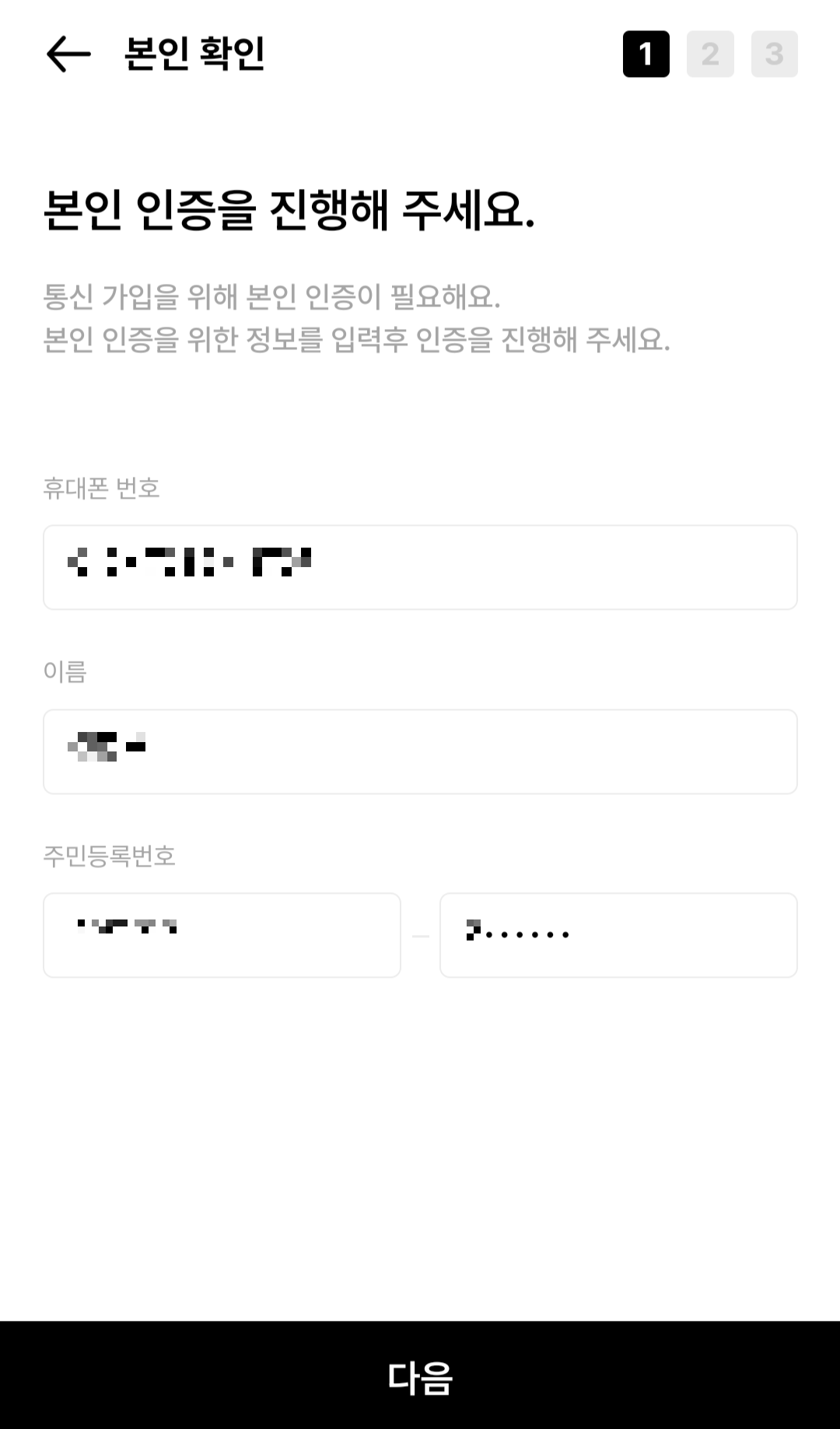 먼저 본인인증을 진행하는데, 여기서 휴대폰 번호는 반드시 번호이동할 번호를 적어야한다. 그냥 본인 정보 확인하나보다~ 하고 아무 생각 없이 메인 번호 넣었더니 마지막에 번호이동 신청서에 메인 번호가 적혀있어서 처음부터 다시(...) 입력했다.