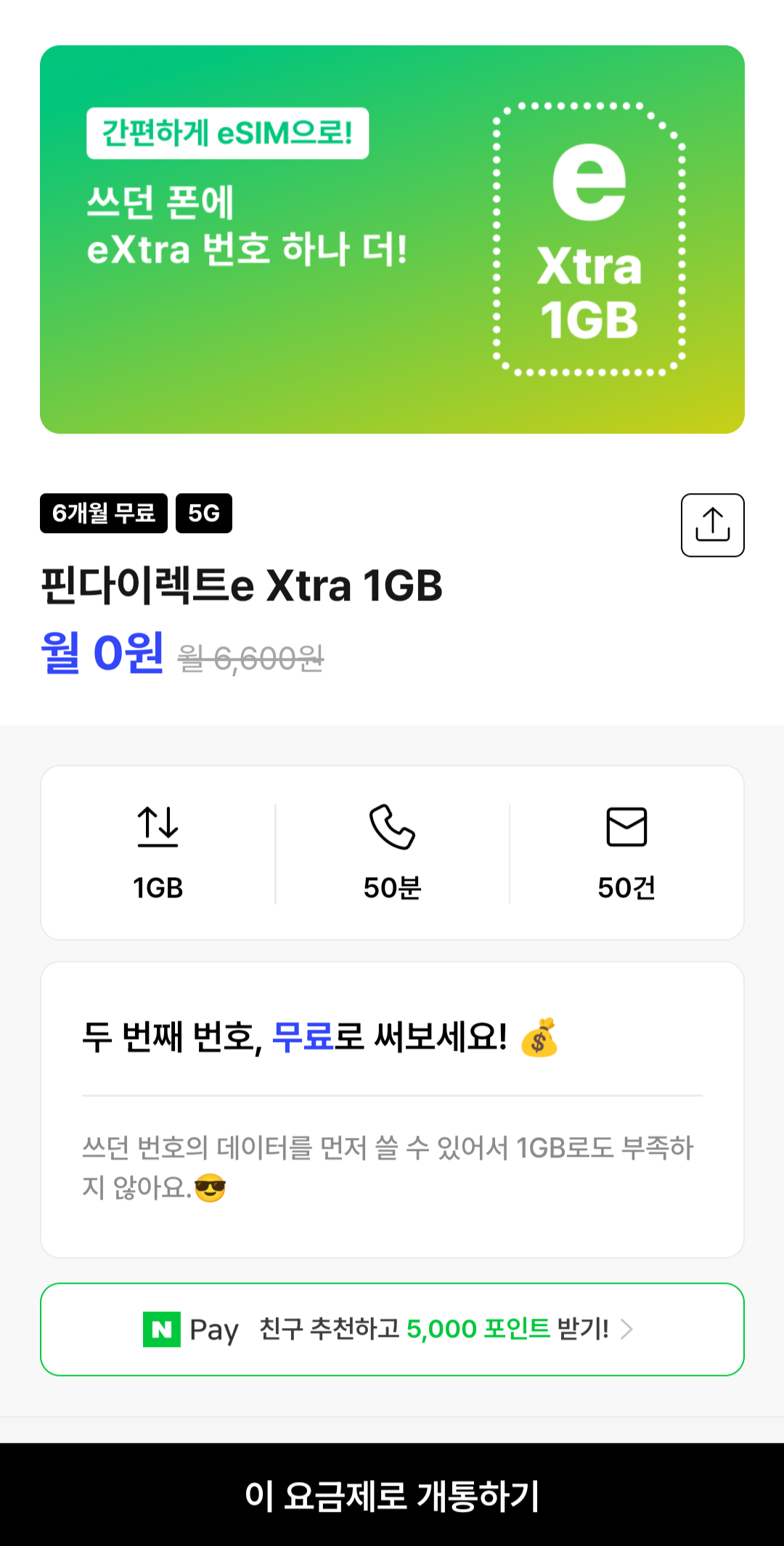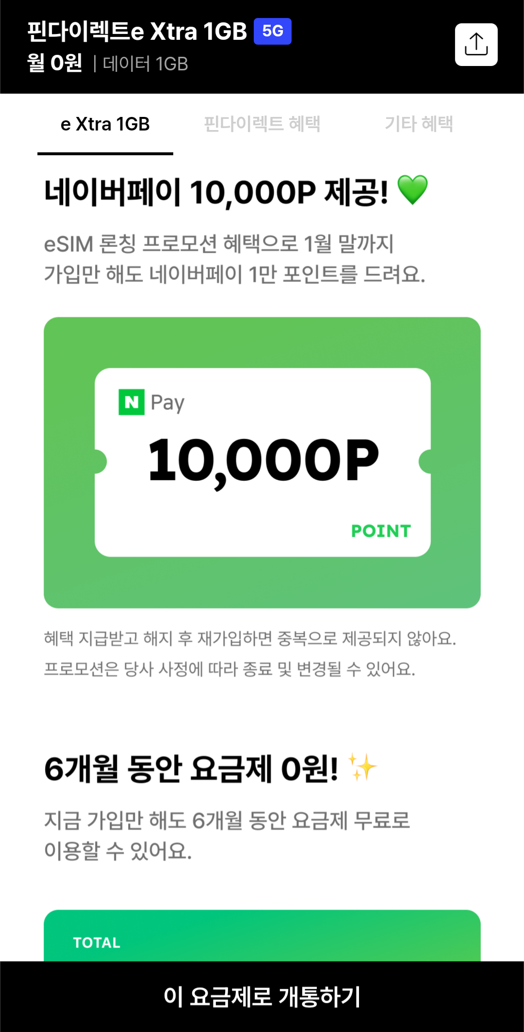 6개월간 통신비 0원에 네이버페이 10000포인트 제공...! 저번달에 가입했으면 e심 비용 2750원까지 무료였는데 그때는 신규가입한지 3개월이 지나지 않아 아쉽게 놓쳤다 (중립번이 하기엔 귀찮아서).