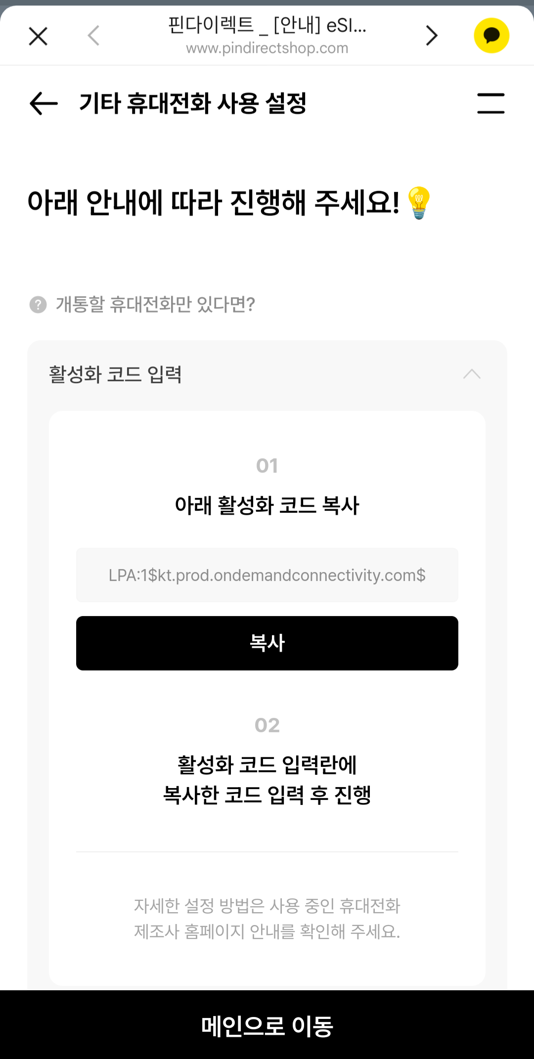 링크된 페이지에 있는 활성화 코드를 복사한 후, 설정-네트워크 및 인터넷-SIM 오른쪽의 +버튼을 눌러 eSIM 추가 메뉴를 누른 다음 좌측 하단 도움말 메뉴-"QR 코드 스캔 중에 문제가 발생하나요? 직접 입력" 링크를 눌러 코드를 붙여넣는다. 아니면 그냥 다른 기기에서 위 페이지를 띄워놓고 QR코드를 스캔해도 된다.