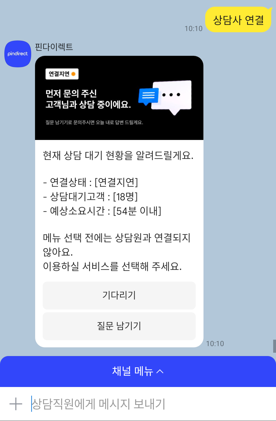 핀다이렉트는 카카오의 자회사답게 카카오 채팅상담을 적극 활용한다. 개인적으로 전화 고객센터는 상담원이 연결될때까지 전화를 붙잡고 있어야하고 말로 설명하기 복잡한 내용들은 전달하기가 힘든데 반해, 채팅상담은 대기 과정이 좀 더 수월하고 사진도 보낼 수 있어 편리하다고 생각함.