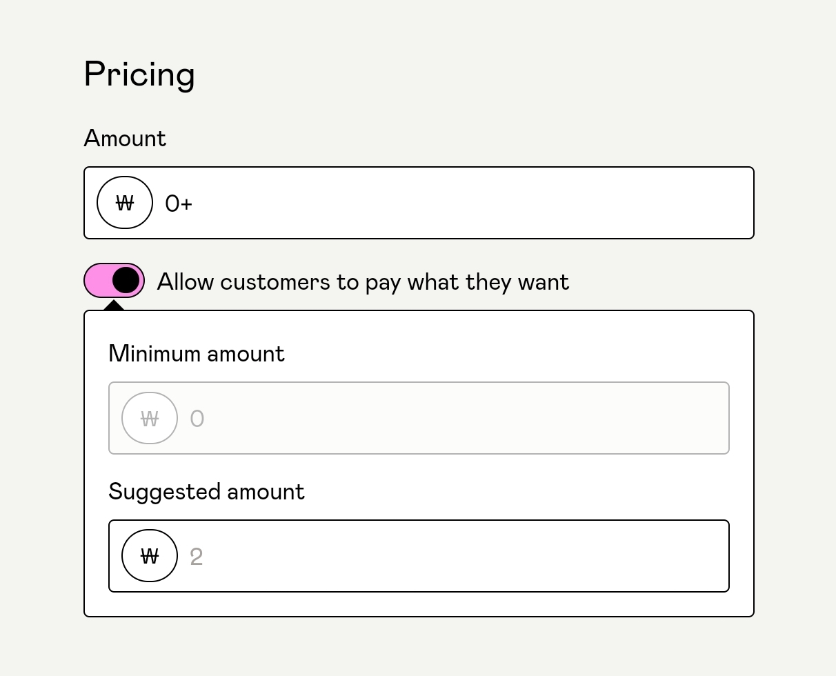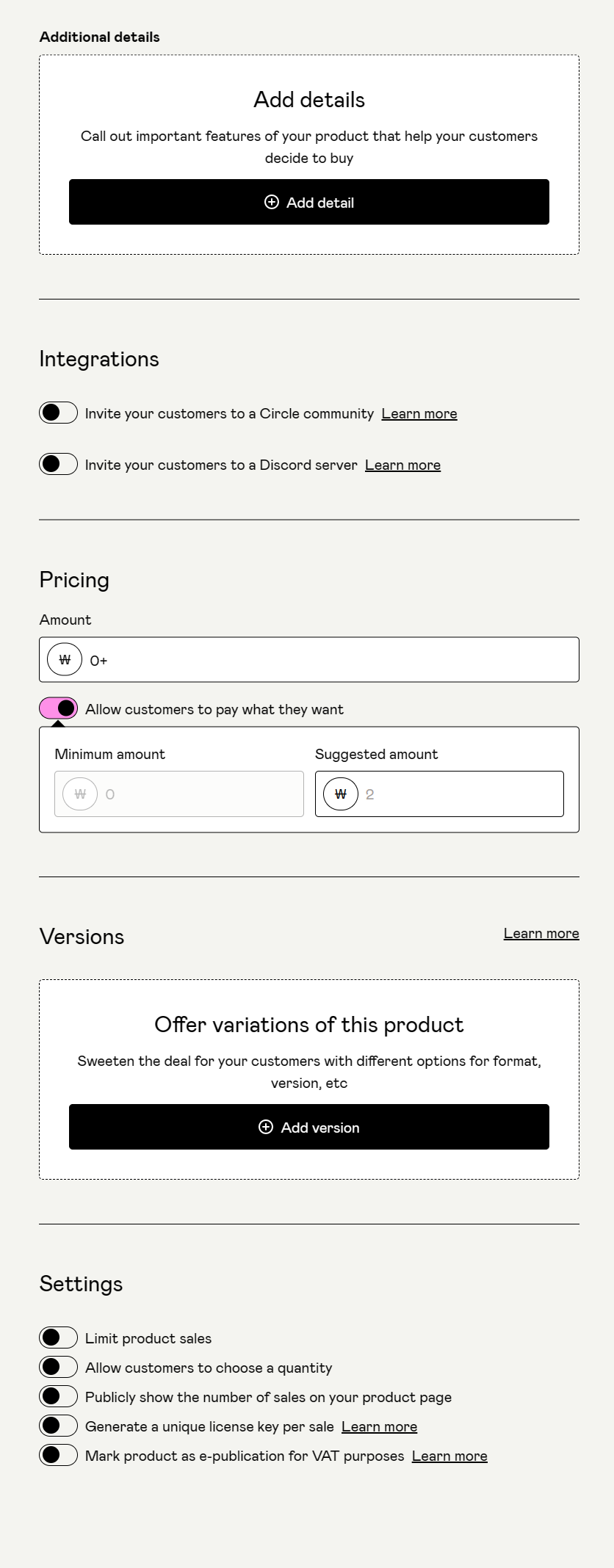 구매자가 원하는 금액을 입력하여 결제하는 기능은 없지만 대신 3000원 단위로 후원하는 기능이 존재하고, 프로모션 코드 기능이 없는 대신 미리 설정한 시작일과 종료일 사이에 자동으로 할인이 적용되도록 설정할 수도 있다.