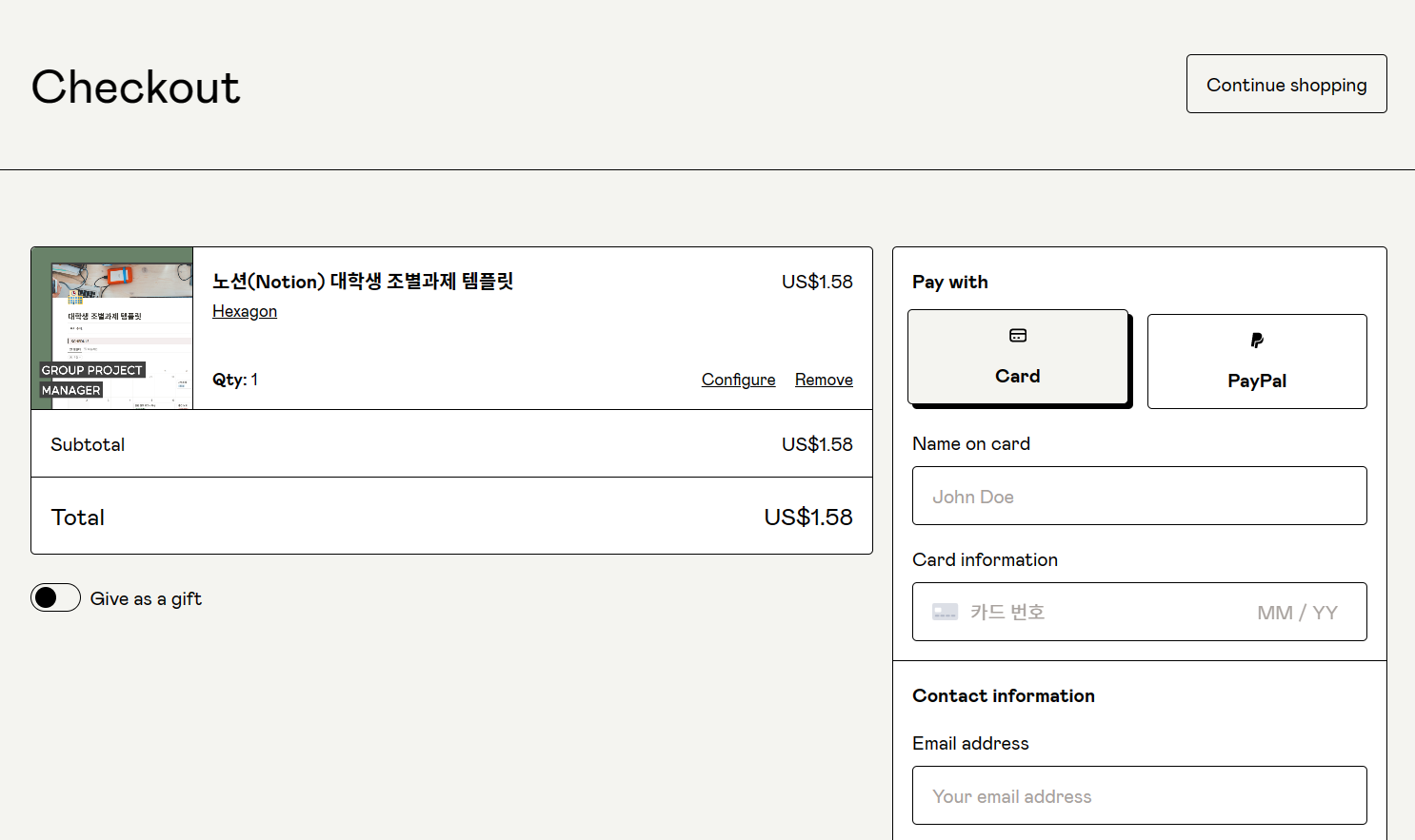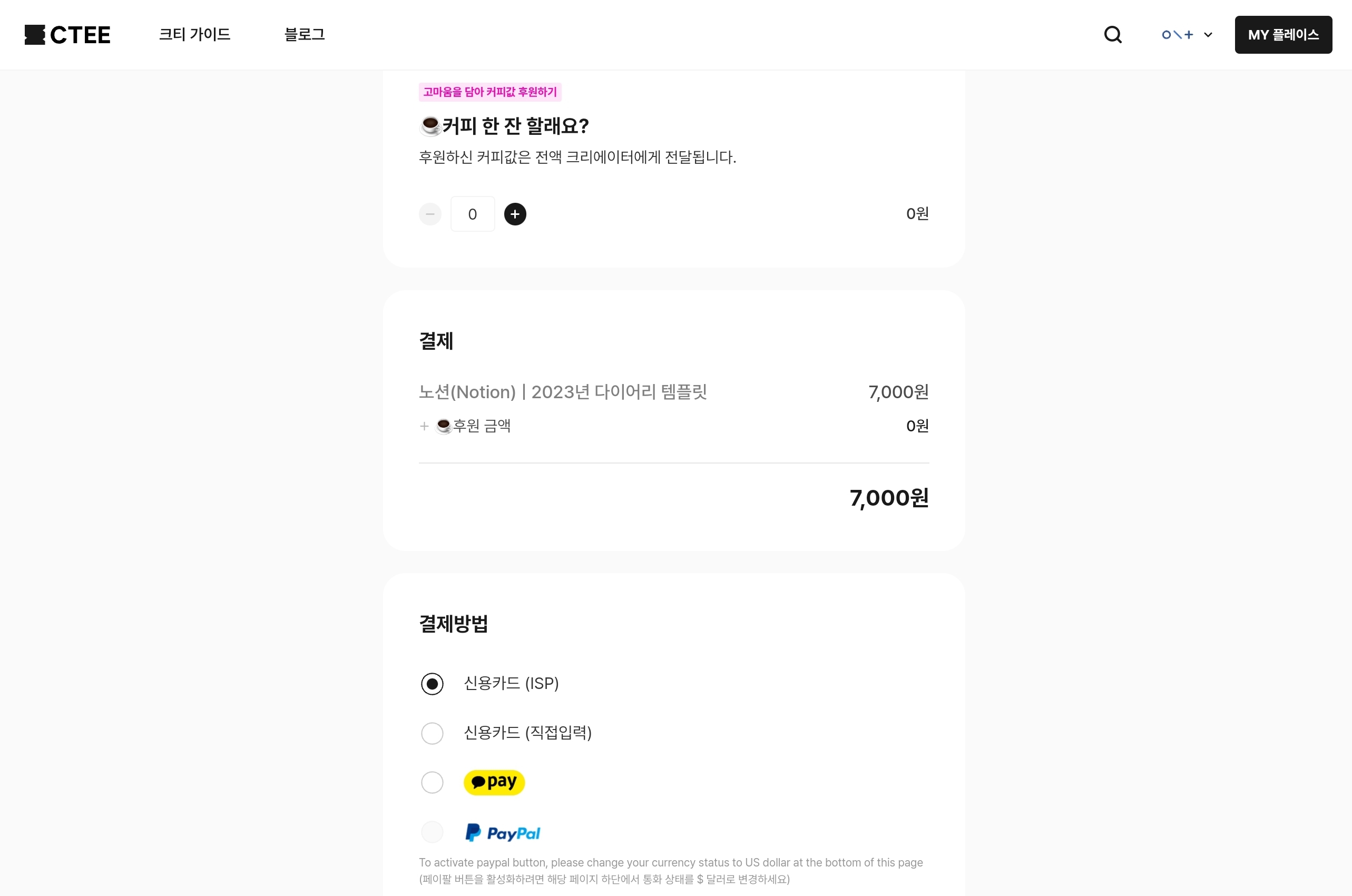 | 지원하는 결제 방식 | 카드, 페이팔 (달러) | 카드, 카카오페이 (원화) 페이팔 (달러) |