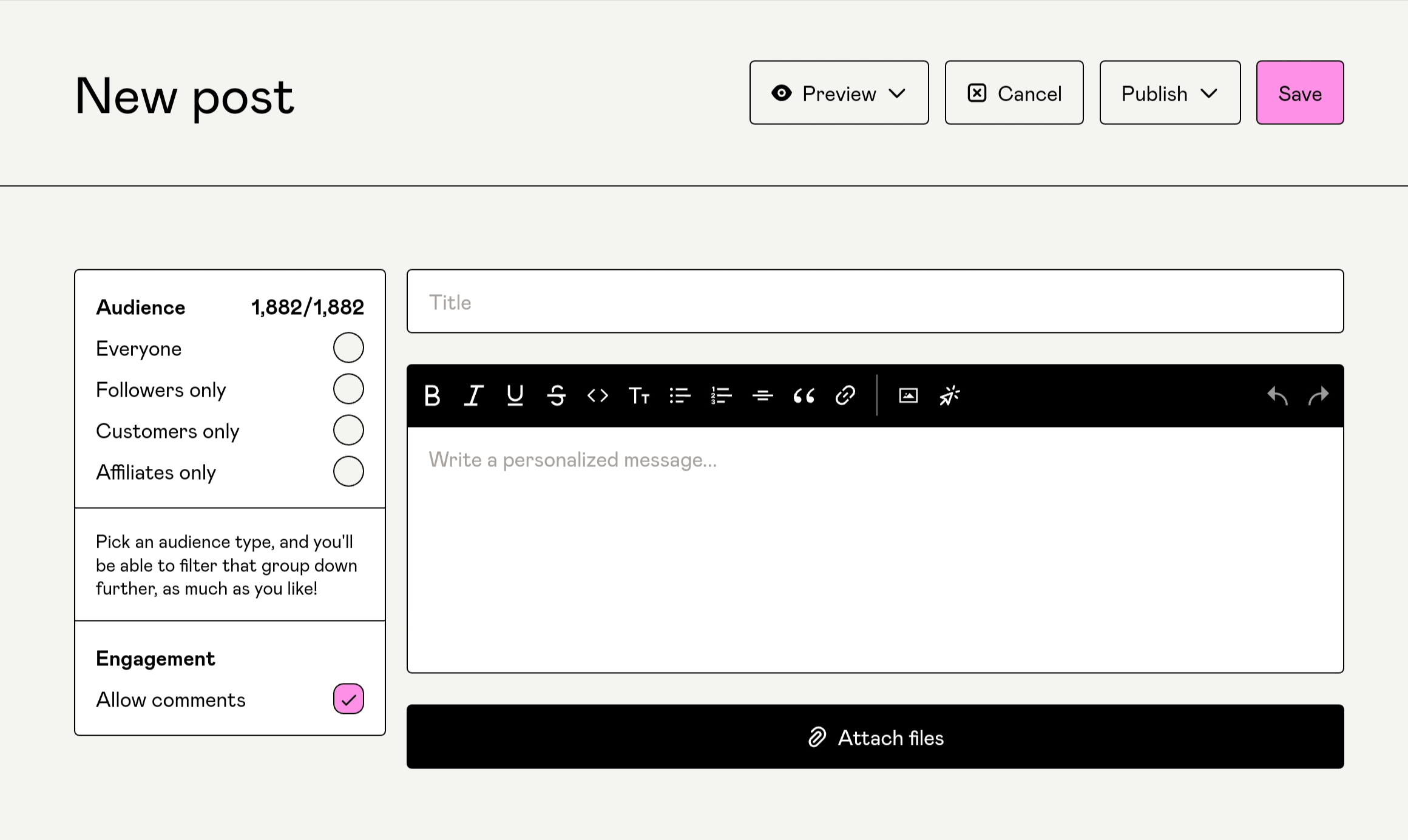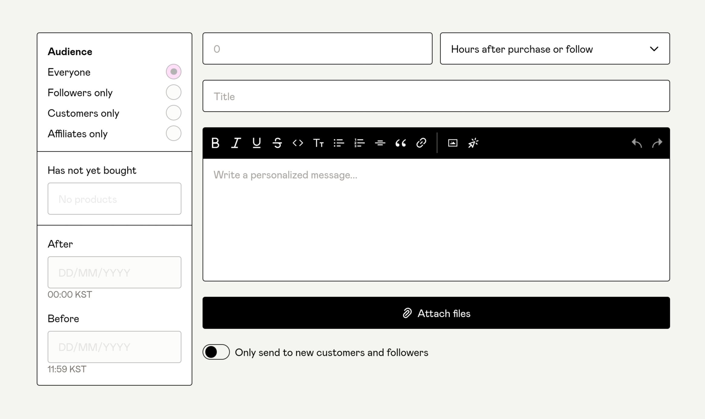 대시보드 왼쪽에 보면 Post라는 메뉴가 있는데, 이는 게시글을 스토어 홈페이지에 올리거나 제품을 구매했던 사람들에게 메일을 보내는 기능이다. 지원하는 필터 규칙이 매우 다양한데, 모든 사람한테 보낼수도 있고, 특정 제품을 구입했던/구입하지 않은 사람들한테만 보낼수도 있고, 특정 기간에 다운받은 사람들한테만 보낼수도 있다.