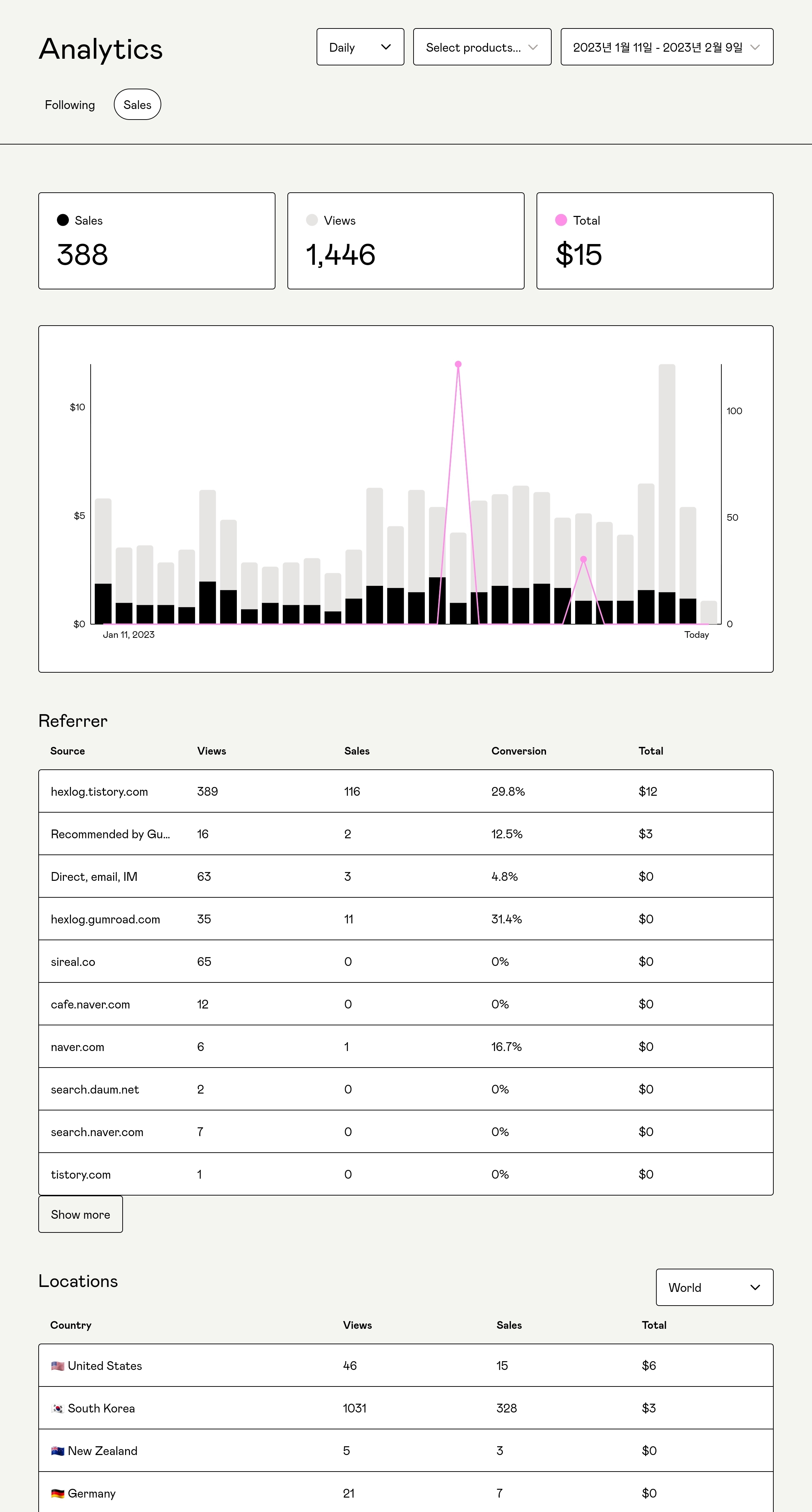 자체 애널리틱스 기능이 상당히 잘 되어있는데, 언제 얼마나 팔렸고, 어떤 사이트에서 유입되었고, 어느 지역의 사용자들이 방문했는지 한눈에 파악이 가능하다. (역시 내 유입 대부분은 블로그에서 이뤄지는구만.)