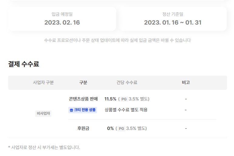 크티의 경우, 상품 판매에 대해서는 플랫폼 수수료 11.5%, 카드결제 수수료 3.5%를 부과하고, 후원금은 플랫폼에서 수수료를 안챙기는 대신 카드 수수료는 그대로 빠져나간다. 검로드에 비해 다소 높은 편.