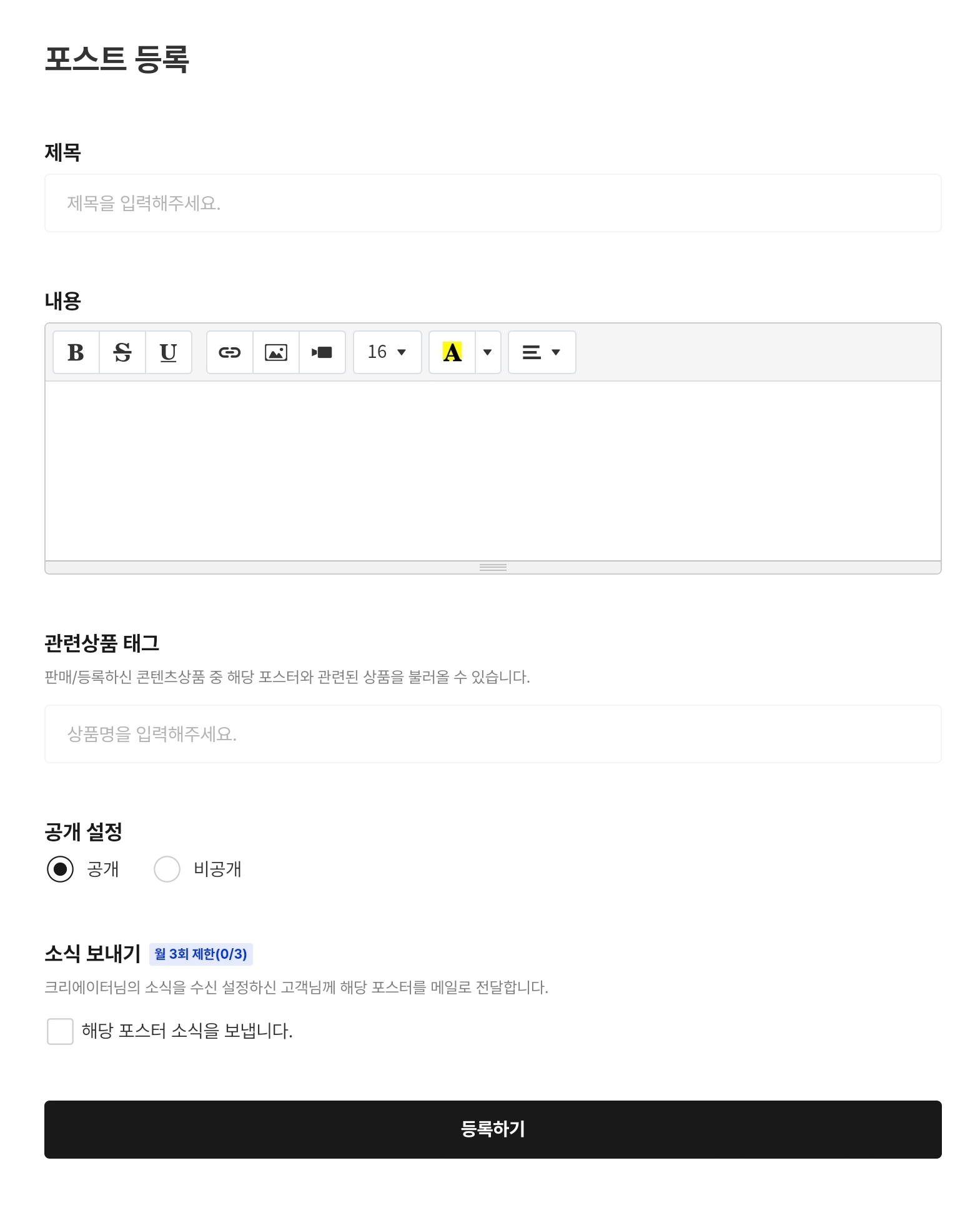 검로드와 마찬가지로 포스트를 작성하여 홈페이지에 등록하거나 구매자에게 메일을 보내는 기능이 있다 (메일 발송은 월 3회로 제한). 검로드만큼 전송 범위를 설정한다던가 세세한 옵션은 없지만 그래도 있을법한 기능들은 다 들어있다.